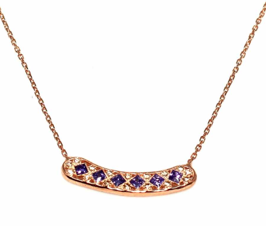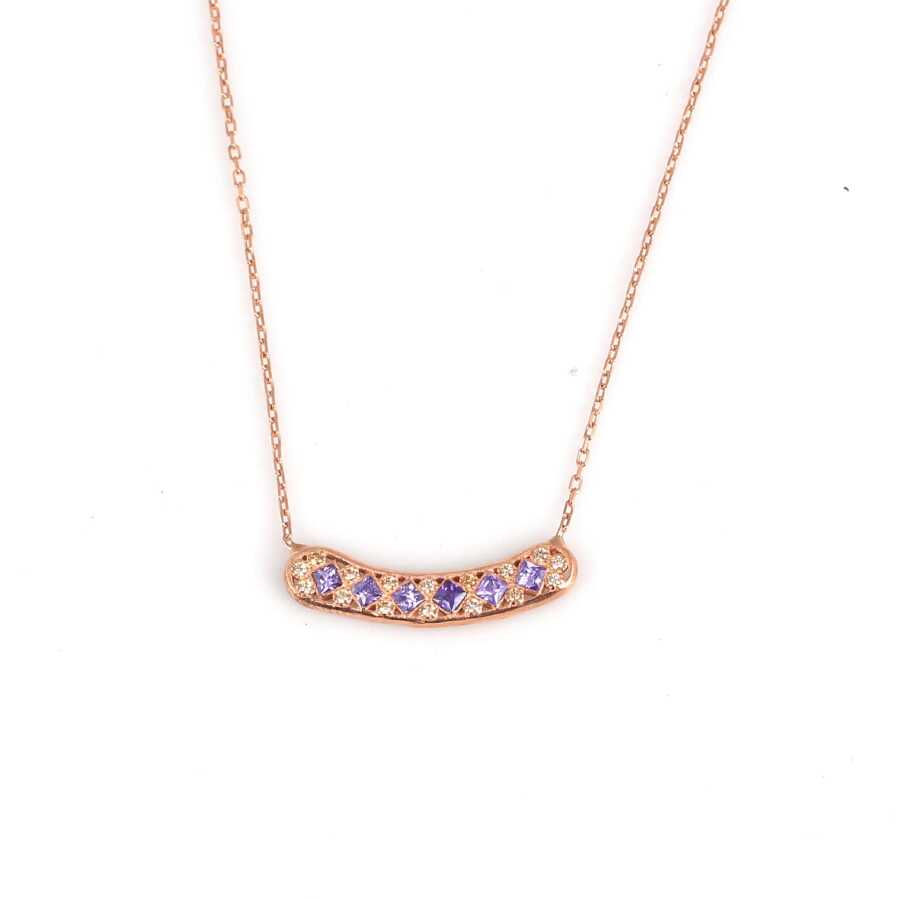 Gümüş kolye 925 ayar gümüşten yapılmıştır. Gümüş kolye 2,4 cm'ye 0,4 cm boyutlarındadır. Zinciri 42 cm uzunluğundadır. Kolye mor ve sarı zirkon taşlıdır. Ağırlığı 2,35 gramdır.