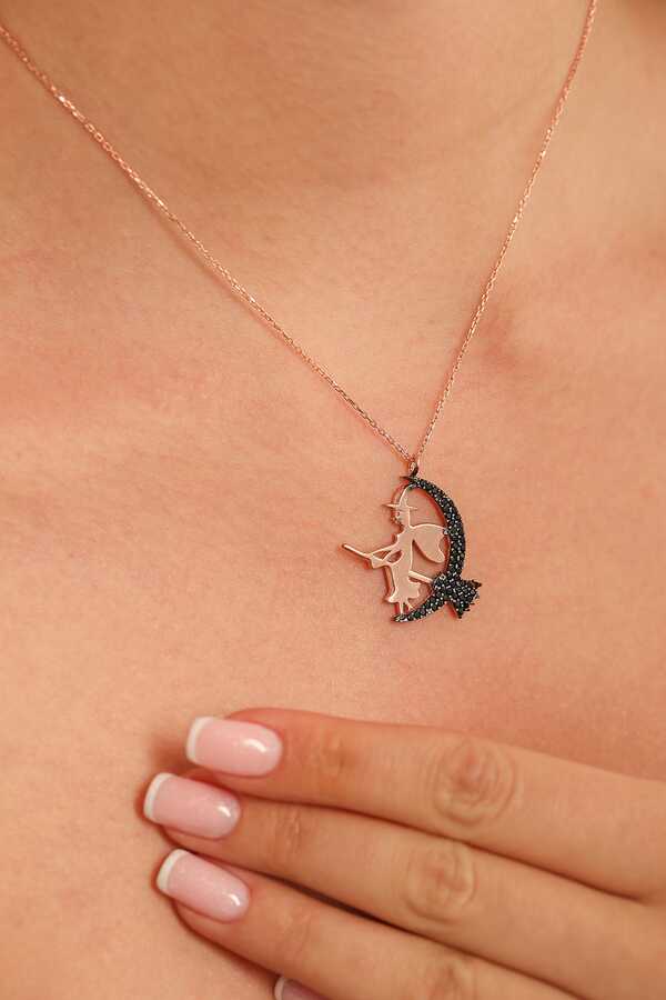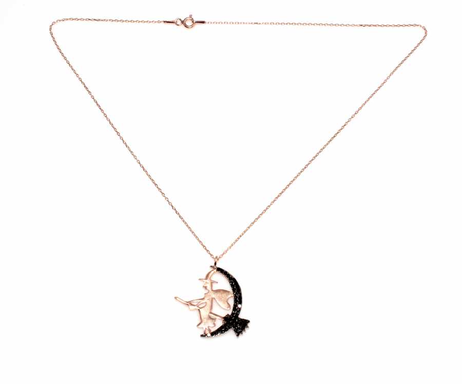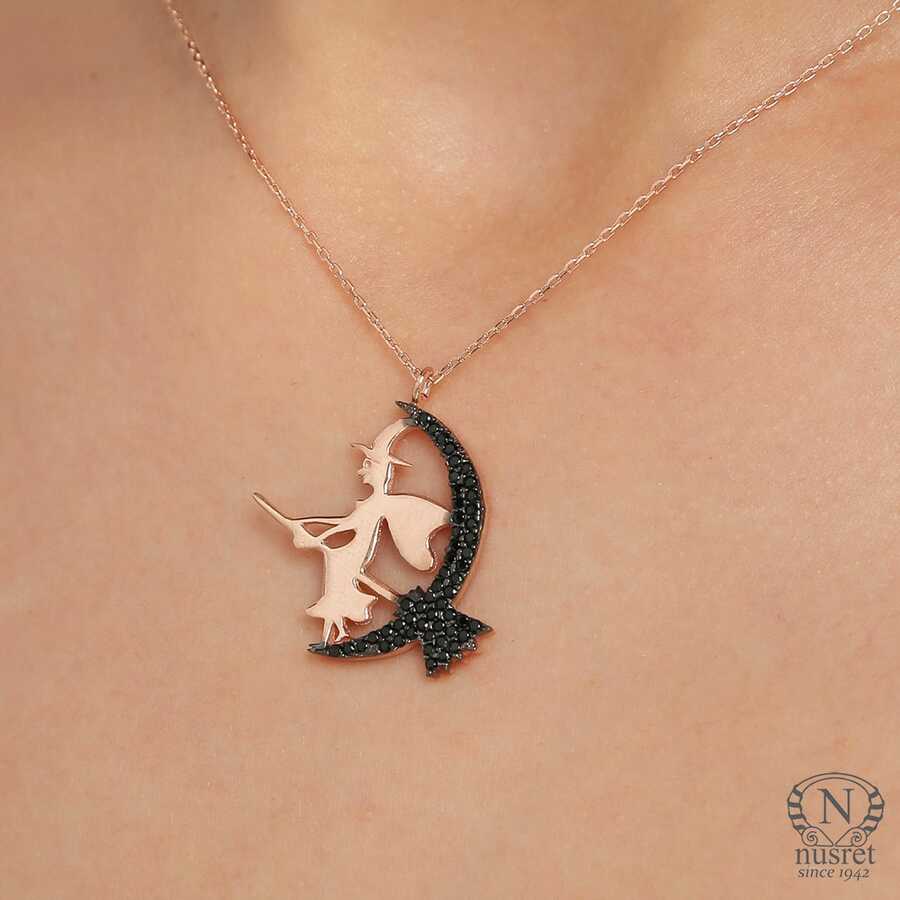 Gelince Haber Ver Ay figürü üzerinde süpürgesiyle tasarlanan cadı detayı, modele mistik ve özgün bir karakter kazandırır. Rose tonlu 925 ayar gümüş yapısı ve siyah taş detayları sayesinde güçlü bir kontrast oluşturur. Hem romantik hem alternatif stil sevenler için dikkat çekici bir tasarımdır.