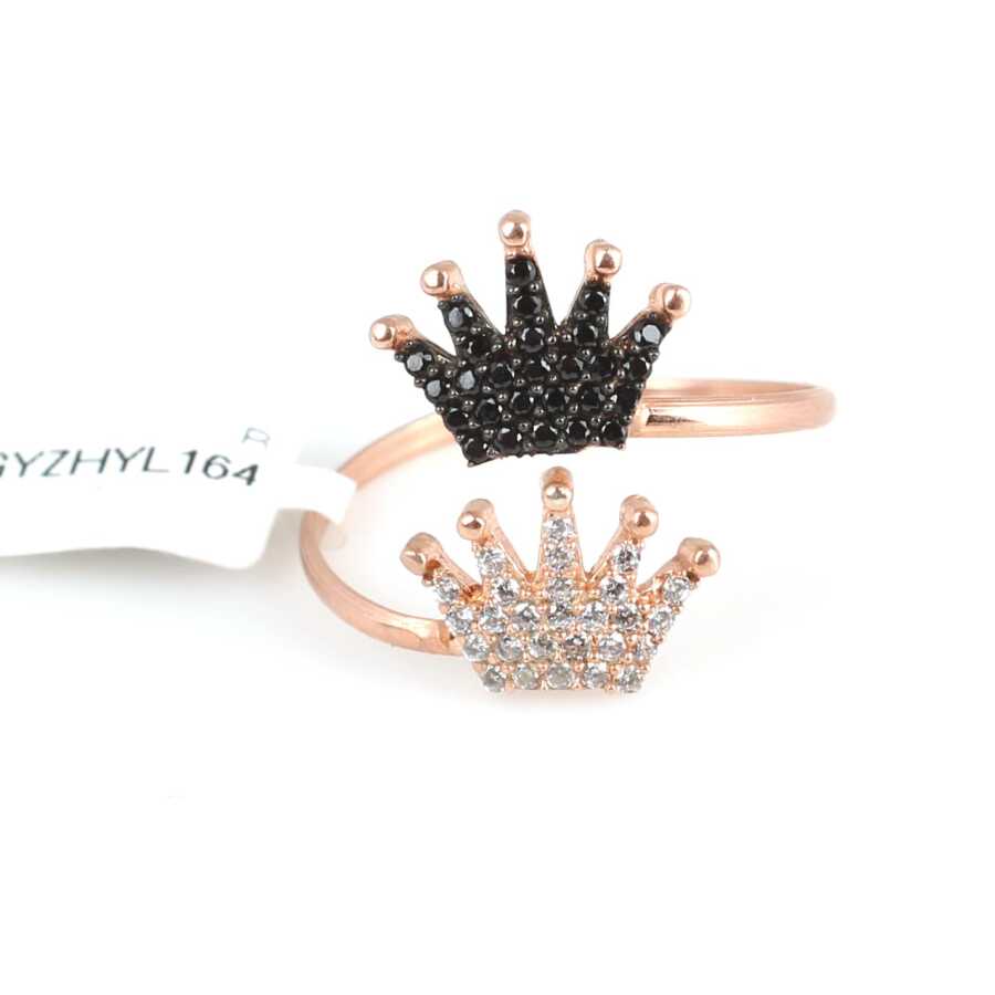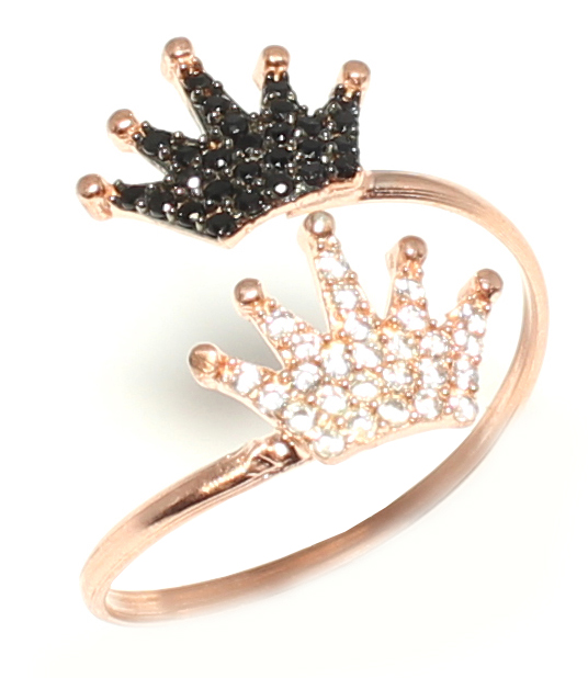 925 Ayar Rose Gümüş Taç Yüzük, Siyah, Beyaz Taş