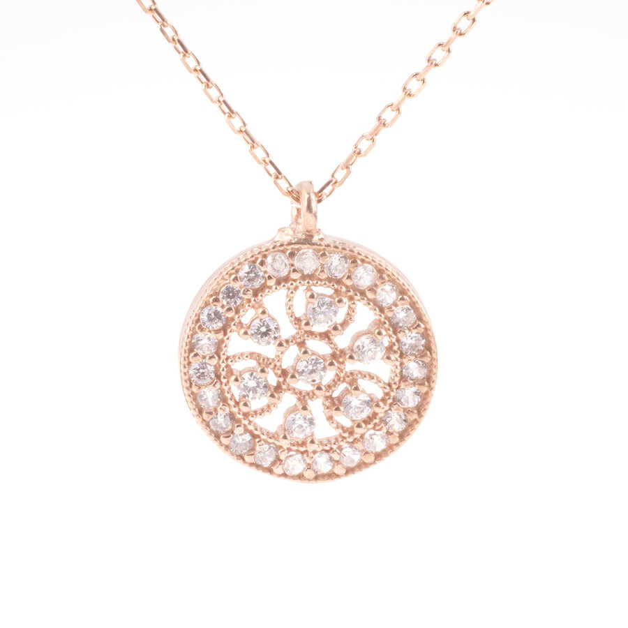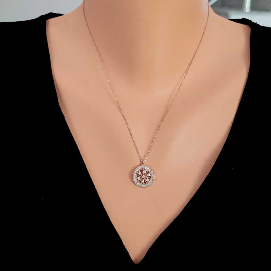 925 ayar gümüşten yapılmış olan bu kolye 1,5 cm boyutlarındadır. Zinciri 42 cm uzunluğundadır ve taşları beyaz zirkondur. Ağırlığı 2,7 gramdır.