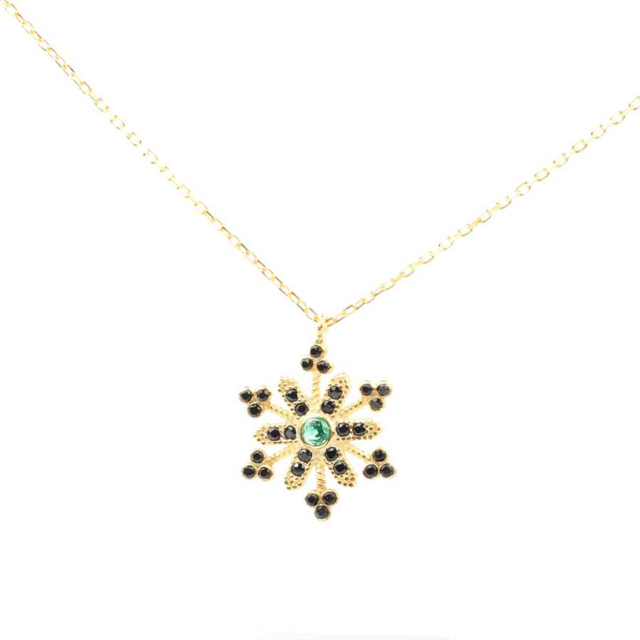 925 Ayar Gümüştür. 44 cm zincir boyu uzatma ile birlikte 47 cm. sarı renk yaldızlı siyah ve yeşil taşlı, Kar tanesi kolye.15 x 17 mm Gramı:2,15 gr