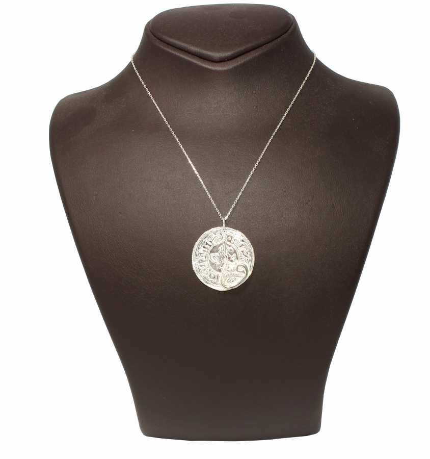 The silver necklace is made of 925 sterling silver. The tuğra necklace is 46 cm long. The necklace is designed with a vav letter figure on the mahmudiye coin. The necklace has no stones. It weighs 6.53 grams.