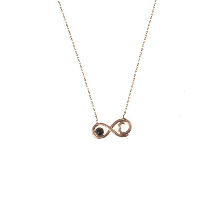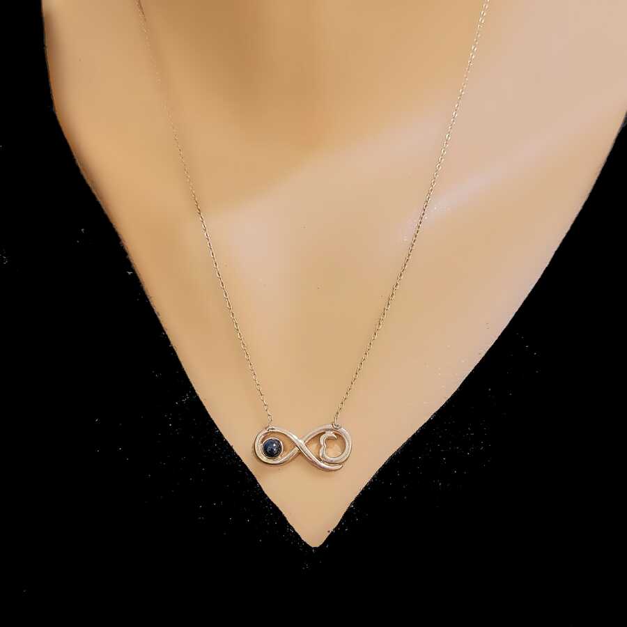 This necklace is made of 925 sterling silver. The infinity-shaped necklace measures 1.5 cm by 1.3 cm. The chain is 41 cm long and the stones are sapphire colour zircon. Rose (Pink) colour. It weighs 2,13 grams.