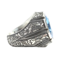 925 Sterling Silver Hand Carved Men Ring with Aquamarine