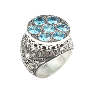 925 Sterling Silver Handcarved Antique Column Design 7's Aquamarine Stone Man Ring