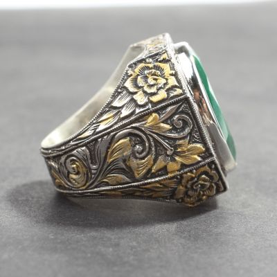 Yüzük 925 ayar gümüşten üretilmiştir. Yüzüğün üzerinde el kalemi atılarak tasarlanmıştır. Gerçek zümrüt taşlı usta işi erkek yüzük, siyah rodajlıdır. Resimdeki yüzük 25 ölçüdür, ancak tüm ölçüler özel olarak yapılabilmektedir. Yüzük gerçek zümrüt taşlıdır. Ağırlığı 34,02 gramdır.