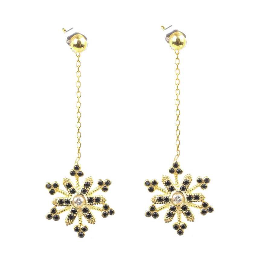 Gümüş küpe 925 ayar gümüşten yapılmıştır. Kar tanesi şeklindeki sallantılı küpe 4,2 cm uzunluğundadır. Kar tanesi 1,6 cm ve zirkon taşlıdır. Sarı renk rodajlıdır. Ağırlığı 2,75 gramdır.