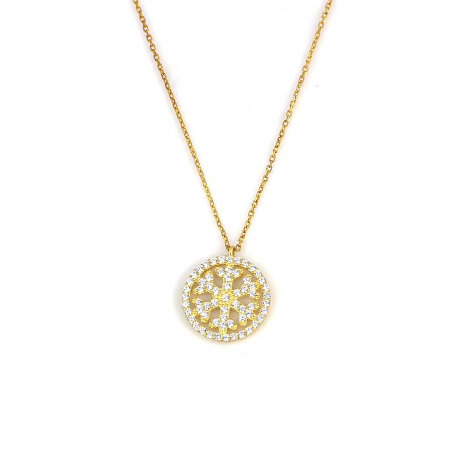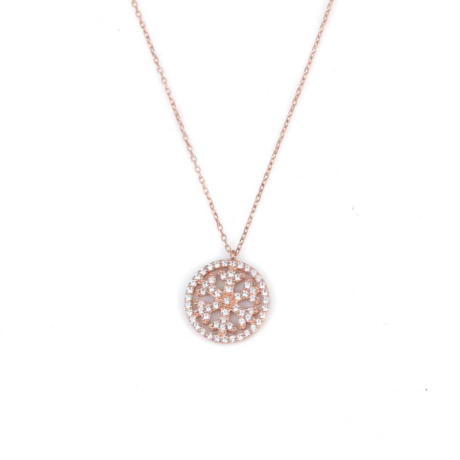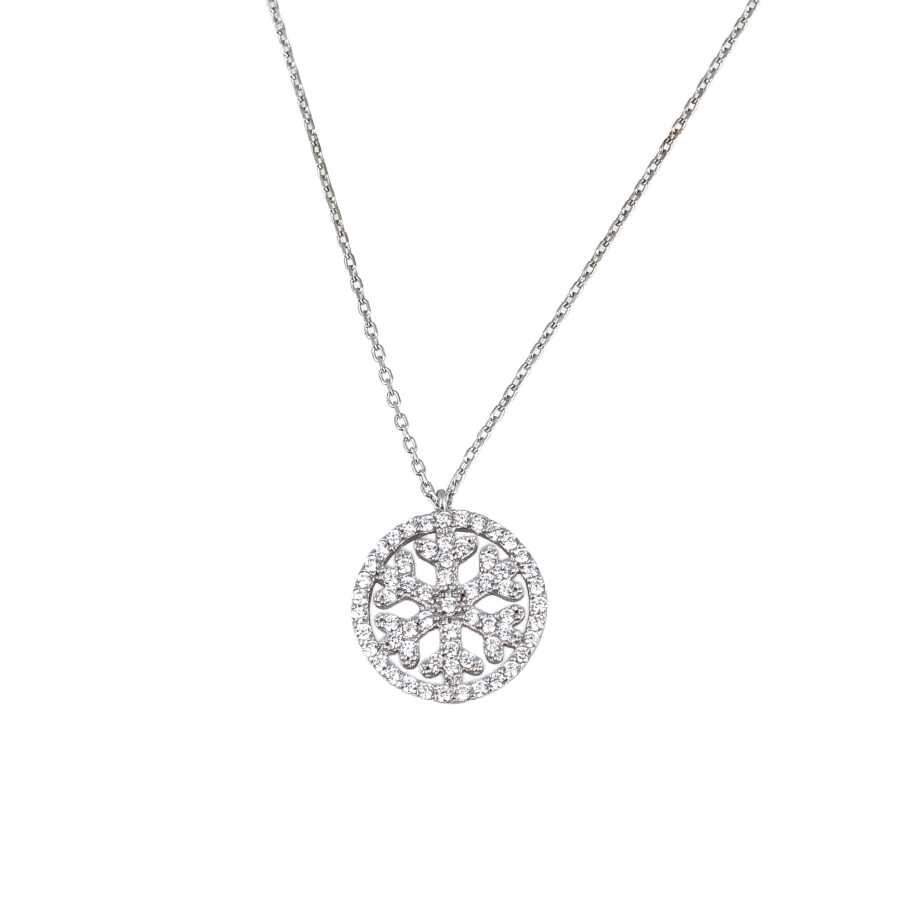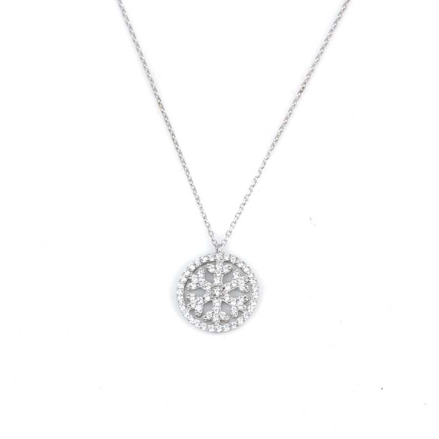 The necklace is crafted from 925 sterling silver. The circular snowflake pendant measures 1.5 cm, comes with a 45 cm chain, and is embellished with zircon stones. The total weight of the necklace is 2.99 grams.