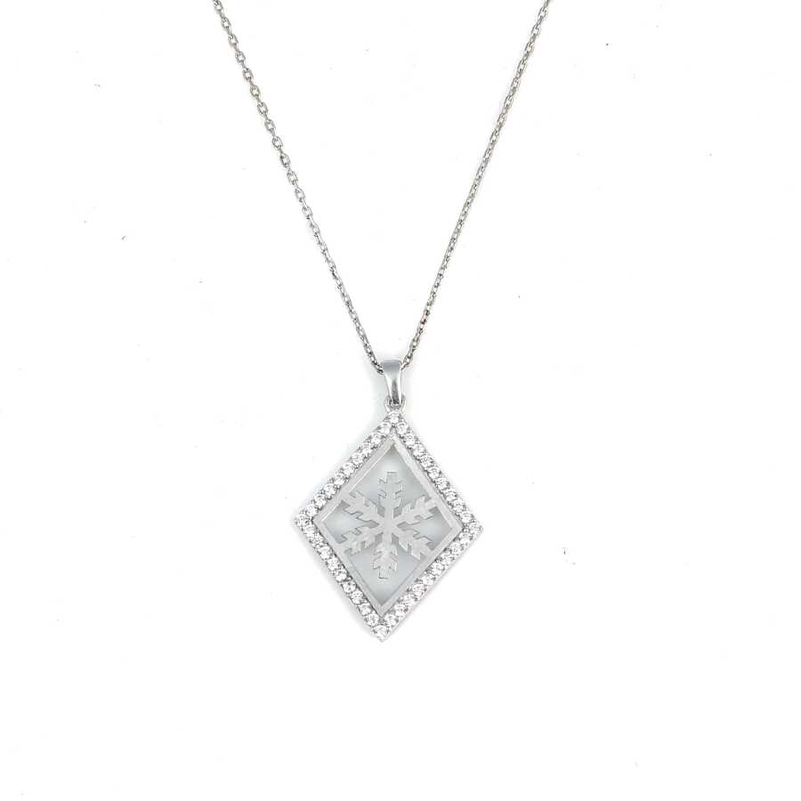 925 sterling silver necklace featuring a square snowflake pendant measuring 2.0 × 2.5 cm. Designed with zircon stones and paired with a 41 cm chain. Total weight: 2.5 grams.