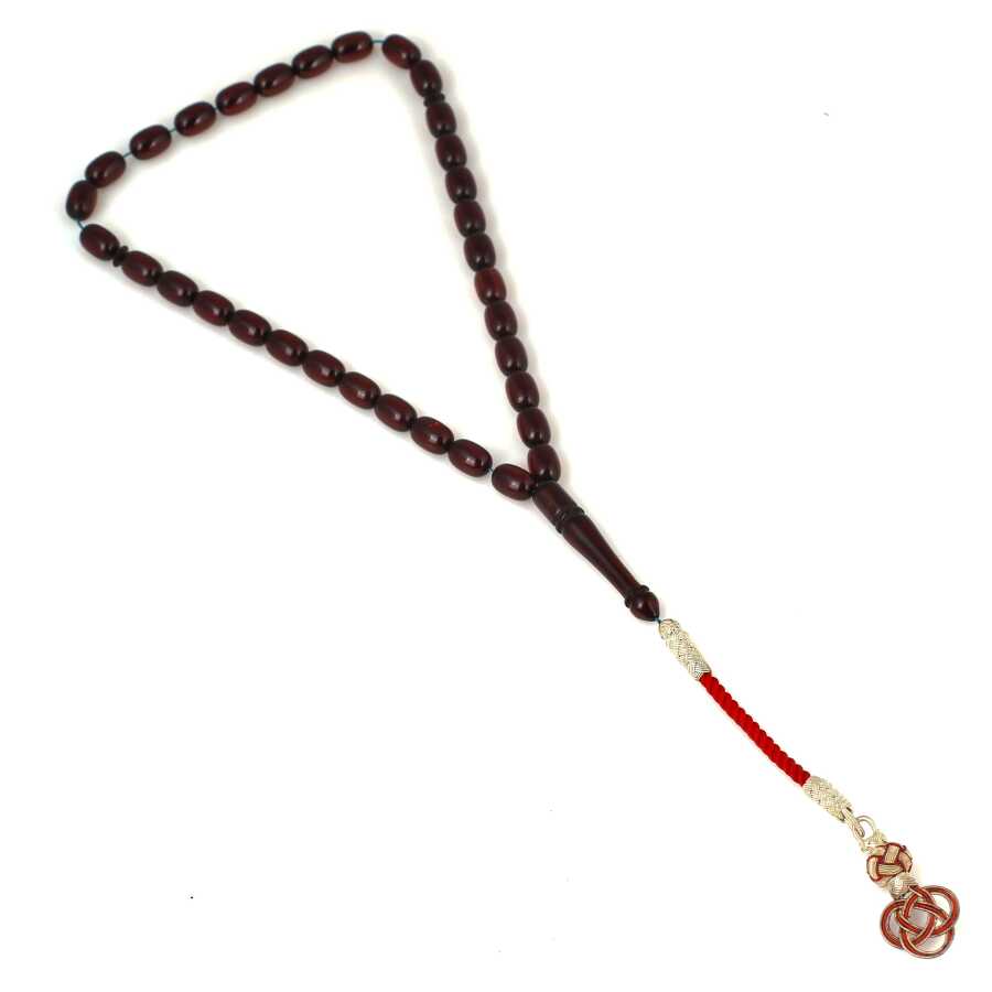 Kapsül kesim bordo renk sıkma kehribar tesbih taşı 1,0 cm'ye 0,7 cm boyutlarındadır. Tespih imamesi dahil 22,5 cm uzunluğundadır. Gümüş püskülü 9,5 cm uzunluğunda olup toplam uzunluğu 32 cm'dir. Ağırlığı 16,34 gramdır.