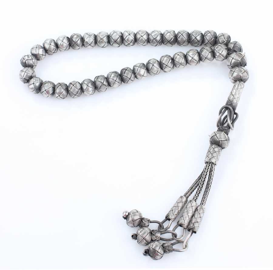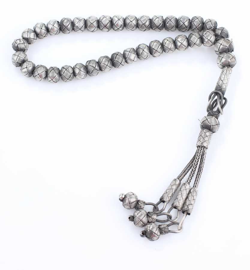999 ayar gümüştür. 0,8 x 0,5 cm taşlı 20,5 cm tesbih boyu, 7,5 cm püskül boyu Gramı:28,4