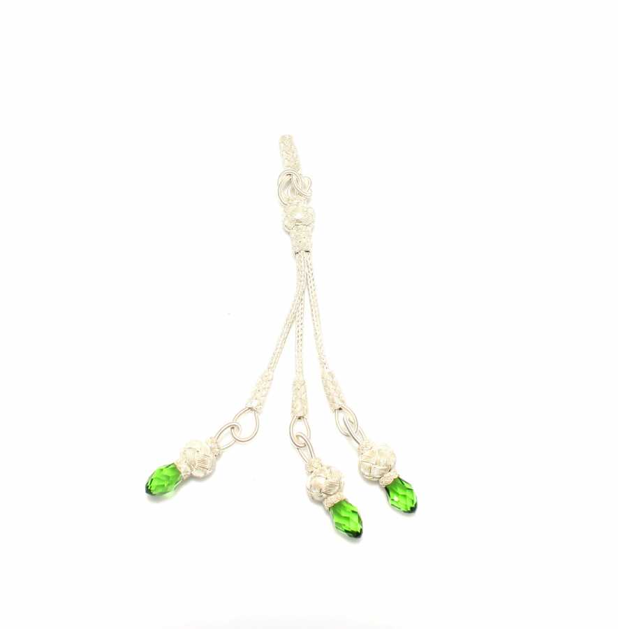 995 has gümüş kazaz örgü, elişi boyu 11 cm, topu 0,85 mm taşları: sentetik zümrüt 3 adet, Gramı:9,35