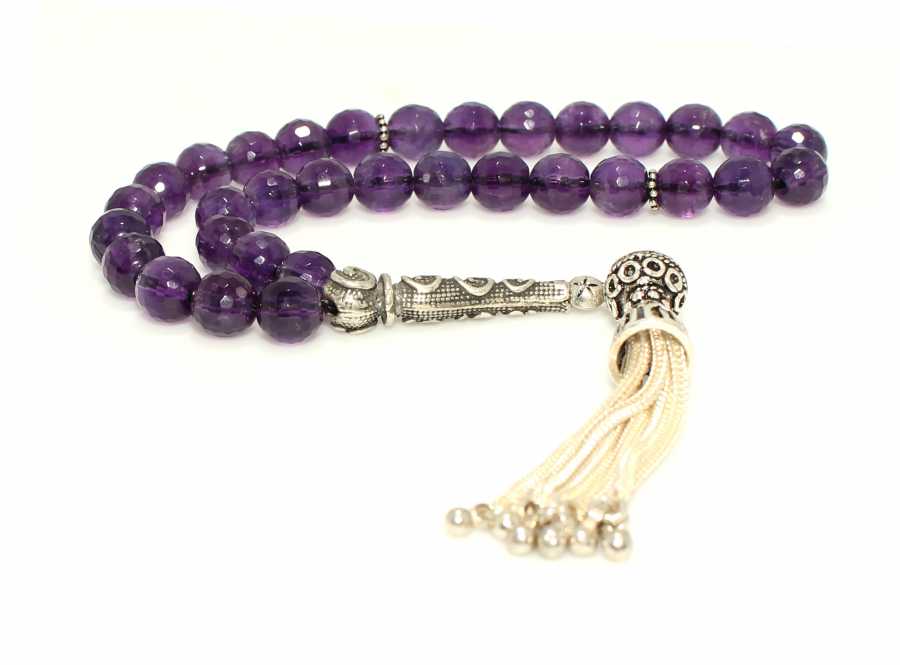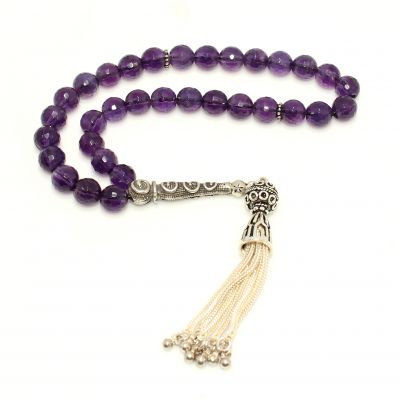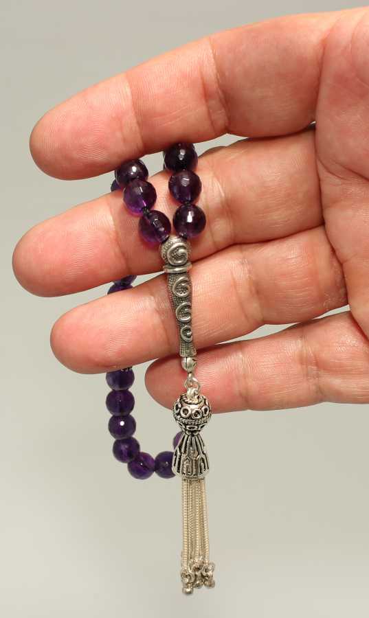 Küre kesim ametist taşı tesbih 0,8 cm boyutlarındadır. Gümüş püskülü dahil tespih toplam uzunluğu 23 cm'dir. Tespihin ağırlığı 34,09 gramdır.