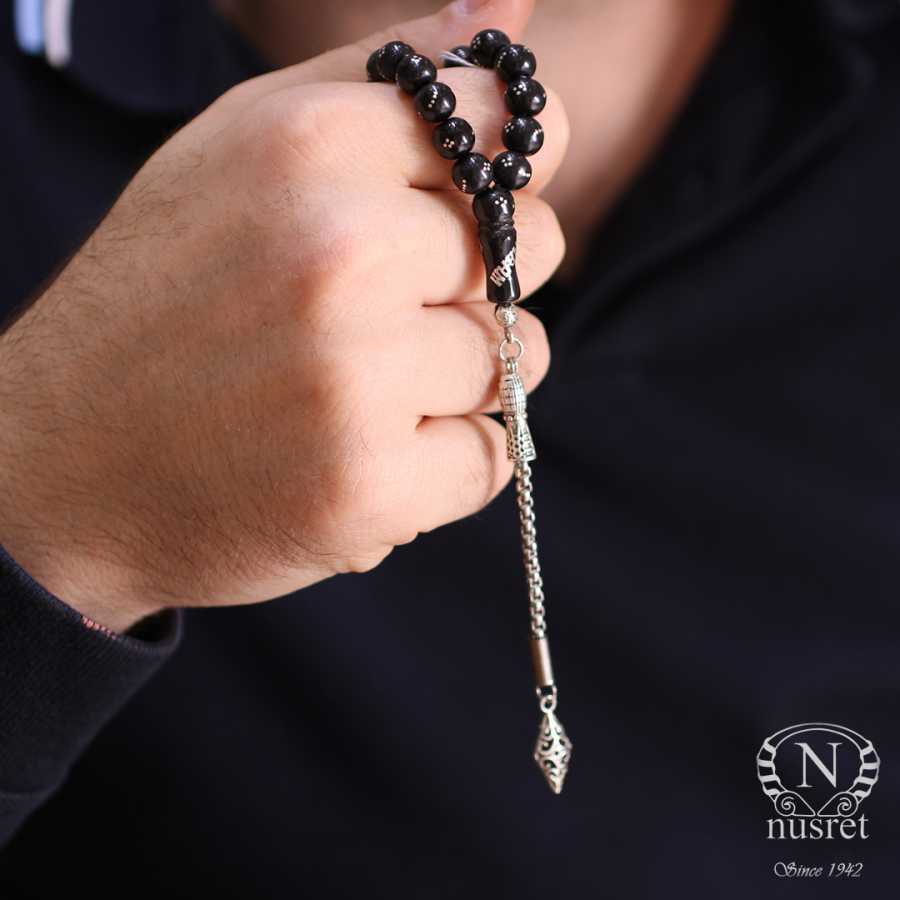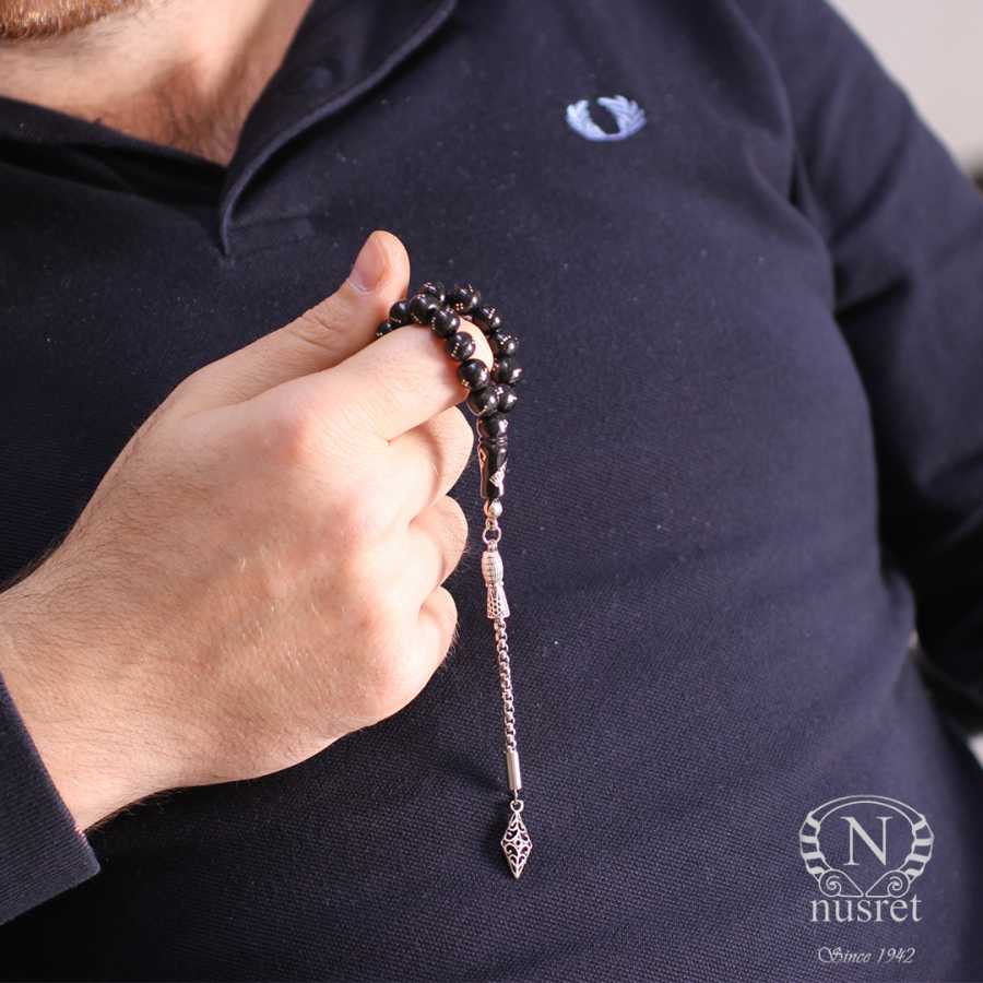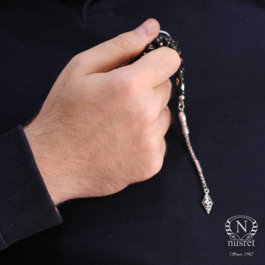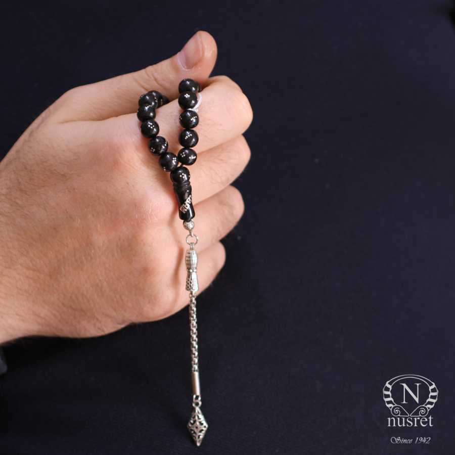 Küre kesim sıkma oltu tesbih taşı 0,8 cm boyutlarındadır. Tespih imamesi dahil 16 cm uzunluğundadır. Gümüş püskülü 10 cm uzunluğunda olup toplam uzunluğu 26 cm'dir. Tespihin ağırlığı 18,98 gramdır.