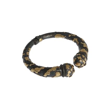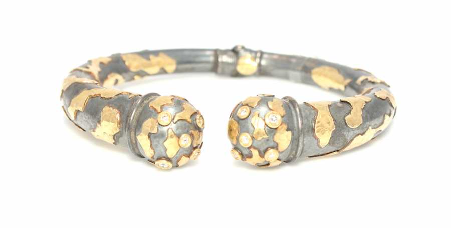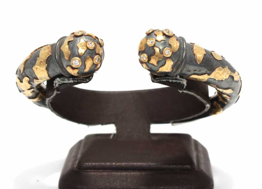 24 ayar altın ve 925 ayar gümüş bilezik çapı: 5,8 x 1,5 cm`dir. yuvarlak şarnel birleşim yeri iki yuvarlak top ile bütünleştirilmiştir. Kilidi yaylıdır. Topların üzeri Altın desenlidir. Taşları beyaz zirkondur. Gramı: 8,9