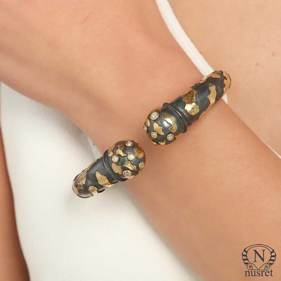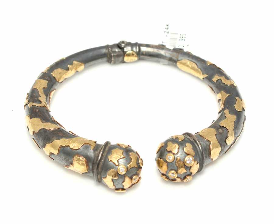 24 ayar altın ve 925 ayar gümüş bilezik çapı: 5,8 x 1,5 cm`dir. yuvarlak şarnel birleşim yeri iki yuvarlak top ile bütünleştirilmiştir. Kilidi yaylıdır. Topların üzeri Altın desenlidir. Taşları beyaz zirkondur. Gramı: 8,9 gr