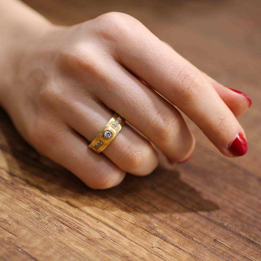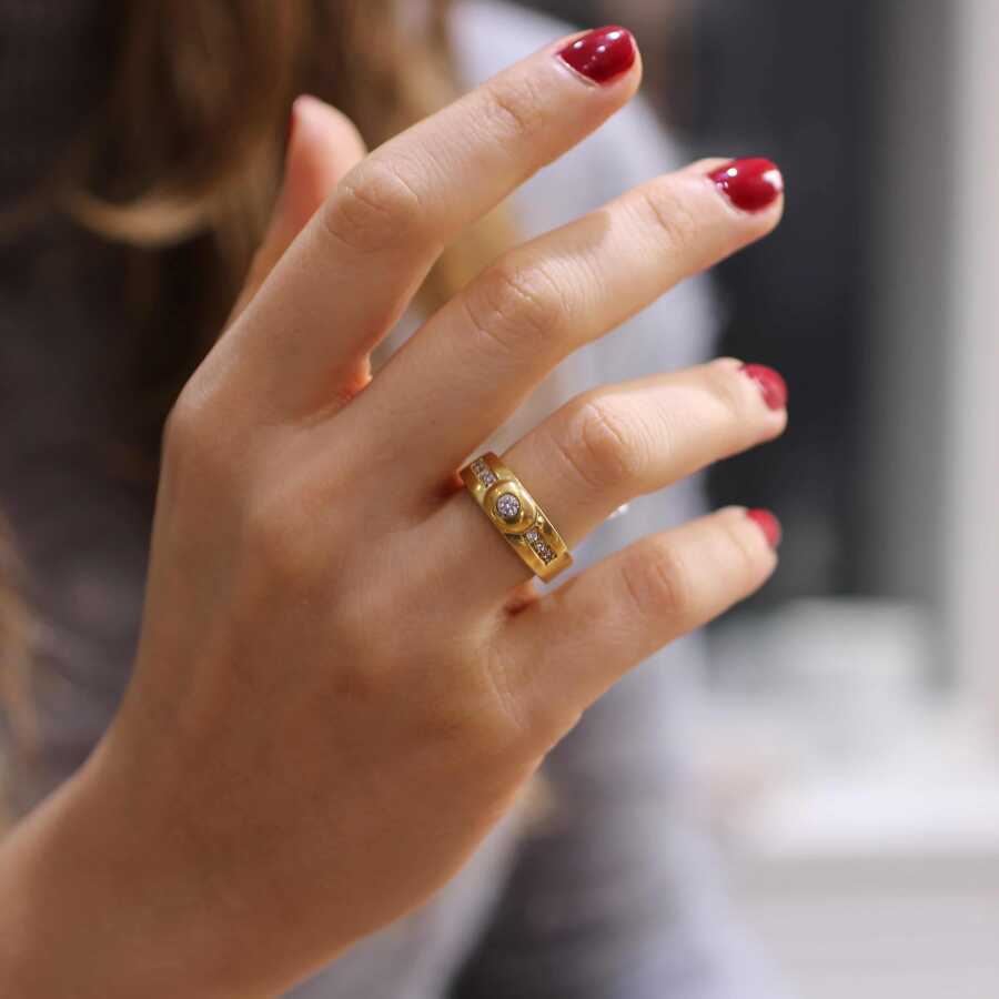 14 ayar altın yüzük ölçüsü: 16,50 x 0,7 mm Taşları Beyaz zirkon 'dur. Ürün yeşil renklidir. Gramı: 6,06 gr Parmak ölçüsüne göre üründe gramaj (artı-eksi) oynayabilmektedir. (-)gram çıkması durumunda müşteri tarafına iade yapılmaktadır, (+)gram çıktığında ilave tutar müşteriden tahsil edilir.