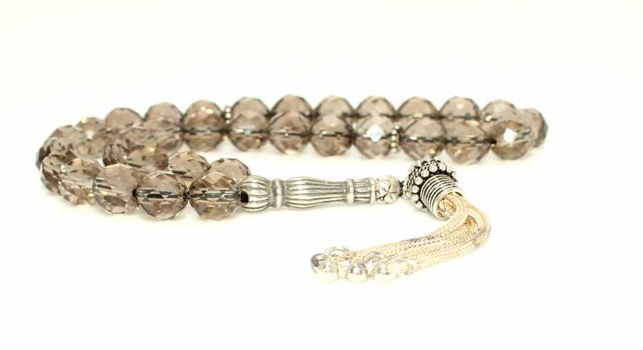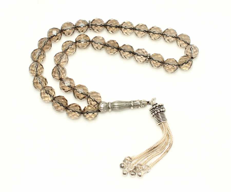 Küre kesim dumanlı kuvars taşı tesbih 0,8 cm boyutlarındadır. Gümüş püskülü dahil tespih toplam uzunluğu 21 cm'dir. Tespihin ağırlığı 31,03 gramdır.