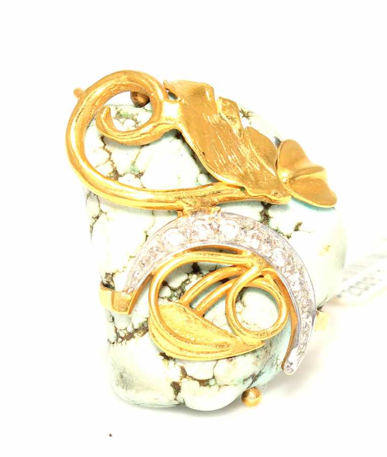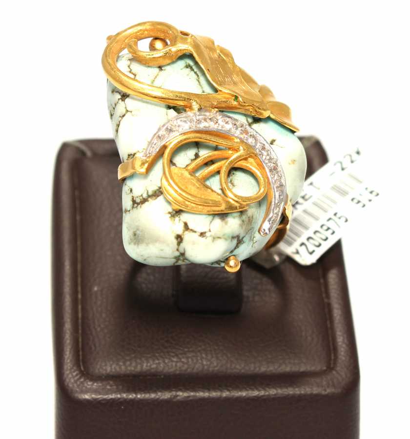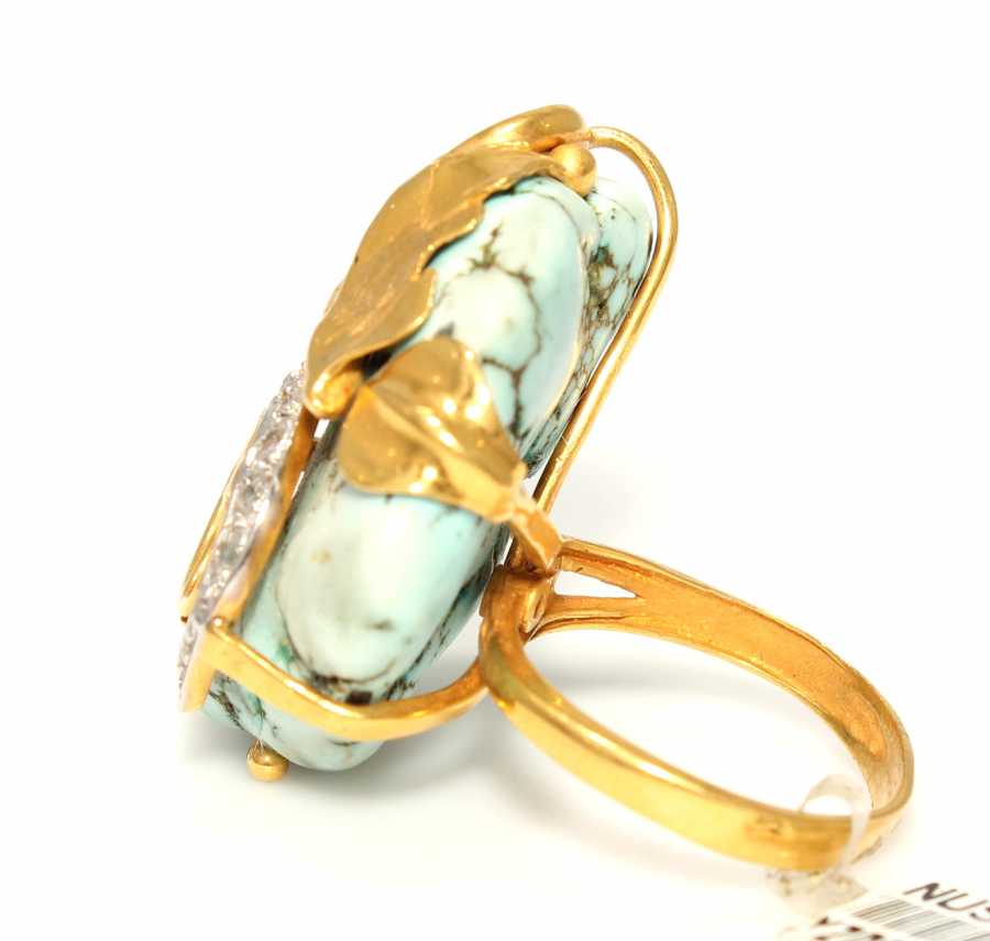 22 ayar altın yüzük ölçüsü: 15 x 3 cm Şekilsiz firuze taşa sarmaşık yaprak uygulanarak imal edilmiştir. yüzük kolu düz. Taşları beyaz zirkondur. Gramı: 9,06