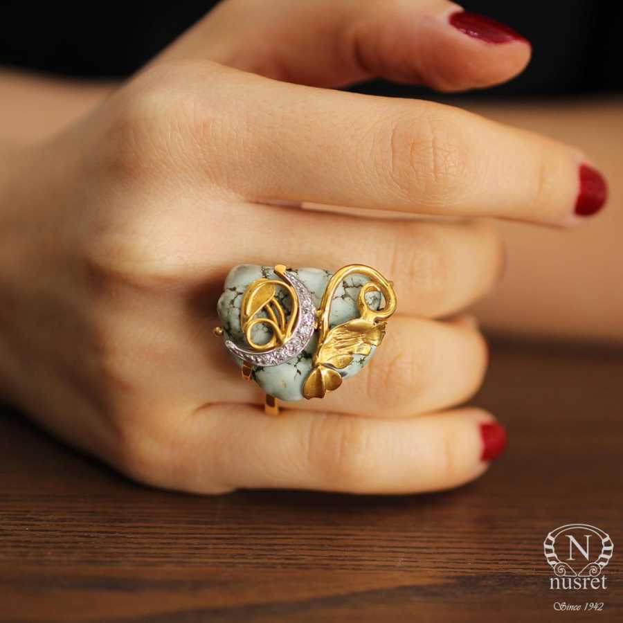 Yüzük 22 ayar altından üretilmiştir. Altın yüzük 15 ölçüdür. Tüm ölçüler yapılabilmektedir. Yüzüğün üst kısmı 3 cm boyutlarındadır. Şekilsiz taş üzerine sarmaşık yaprak uygulanarak tasarlanmıştır. Yüzük turkuaz ve zirkon taşlıdır. Ağırlığı 9,06 gramdır.