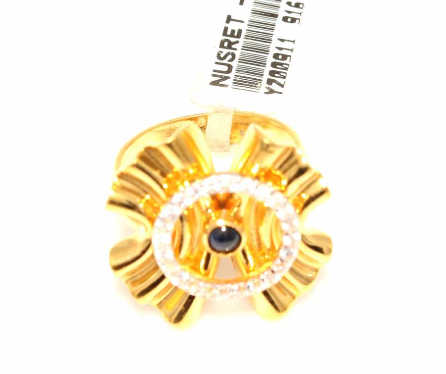 Yüzük 22 ayar altından üretilmiştir. Kırışık gazoz kapağı model yüzük 16 ölçüdür. Tüm ölçüler yapılabilmektedir. Yüzüğün üst kısmı 2,4 cm boyutlarındadır. Yüzük zirkon taşlıdır. Ağırlığı 10,65 gramdır.