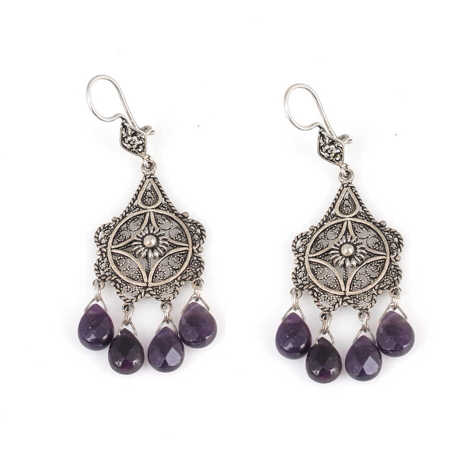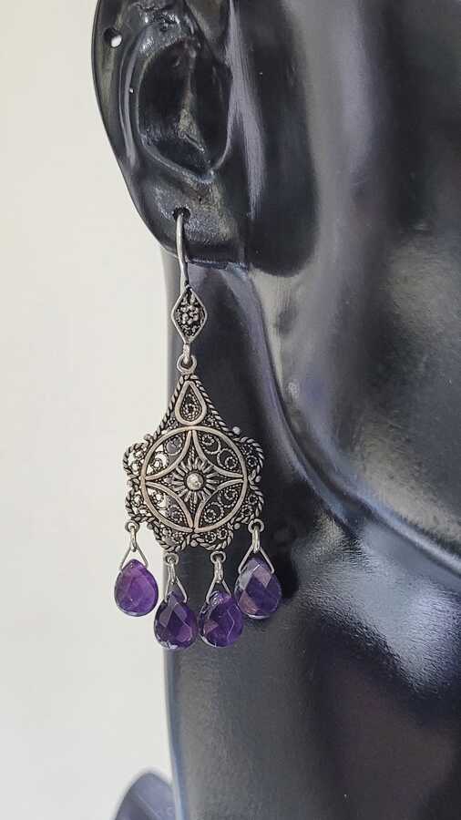 925 Ayar Gümüş Ametist Damla Taşlı Telkâri Küpe
