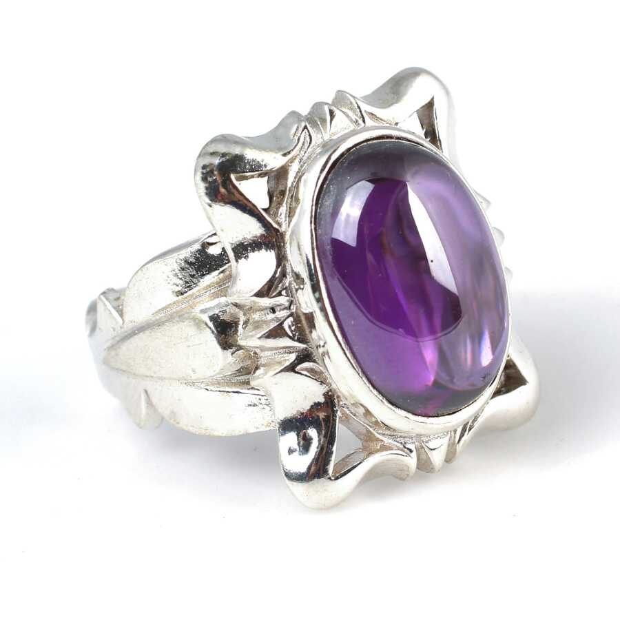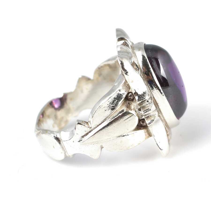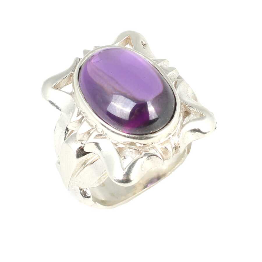Yüzük 850 ayar gümüşten üretilmiştir. Taşlı yüzüğün üst kısmı 25*20 cm boyutlarındadır. Resimdeki yüzük 25 ölçüdür, ancak tüm ölçüler özel olarak yapılabilmektedir. Yüzük ametist taşlıdır. Ağırlığı 22,91 gramdır.