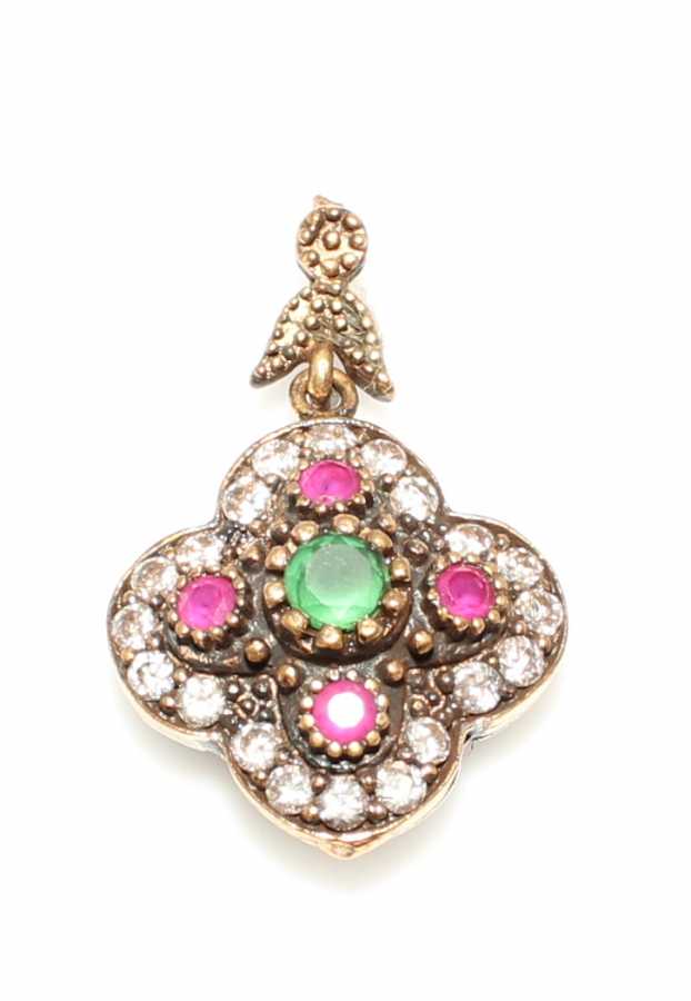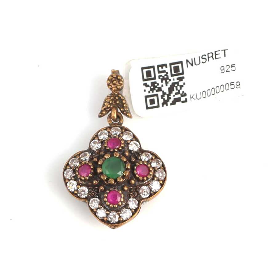 Kolye ucu 925 ayar gümüş ve bronzdan imal edilmiştir. Minik yonca şeklinde kolye ucu 1,8 cm'ye 2,9 cm boyutlarındadır. Zincir dahil değildir. Kolye ucu sentetik zümrüt, yakut ve zirkon taşları vardır. Otantik kolye ucu 4,19 gram ağırlığındadır.