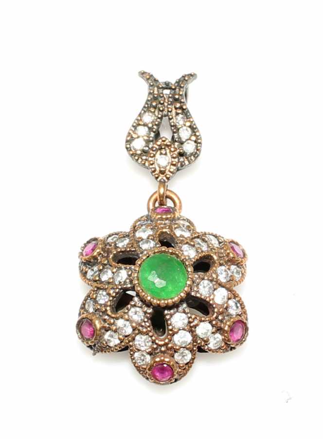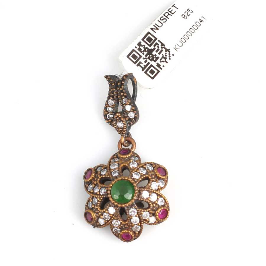 Kolye ucu 925 ayar gümüş ve bronzdan imal edilmiştir. Çiçek şeklinde kolye ucu 1,9 cm'ye 3,7 cm boyutlarındadır. Zincir dahil değildir. Kolye ucu sentetik zümrüt ve zirkon taşları vardır. Otantik kolye ucu 5,57 gram ağırlığındadır.