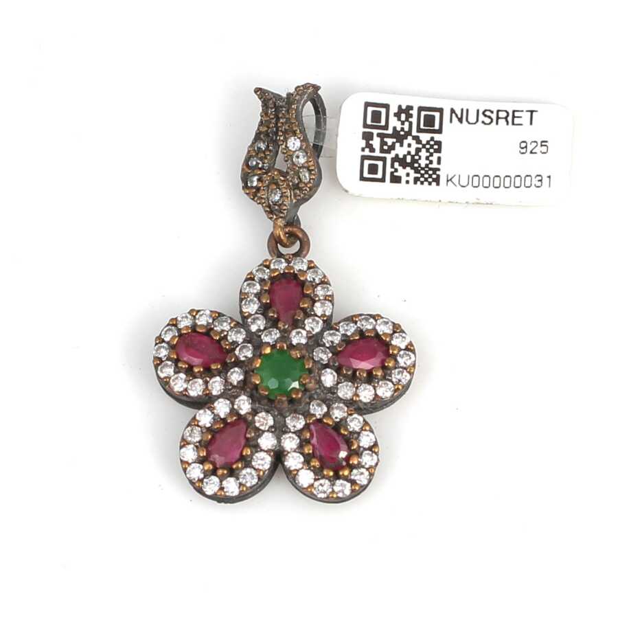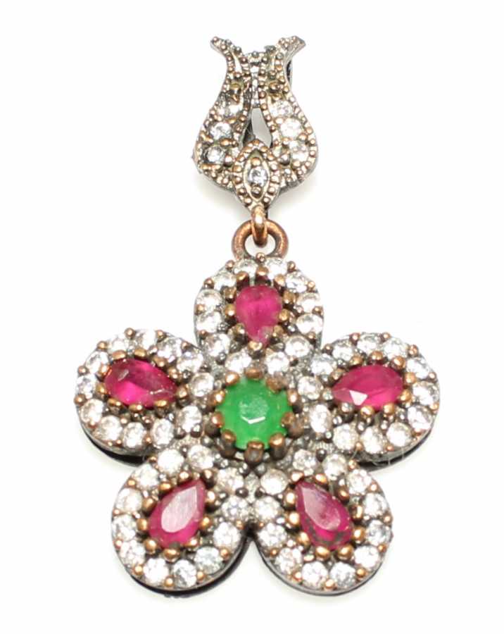 Kolye ucu 925 ayar gümüş ve bronzdan imal edilmiştir. Minik çiçek şeklinde kolye ucu 2,4 cm'ye 4,0 cm boyutlarındadır. Zincir dahil değildir. Kolye ucu sentetik zümrüt, yakut ve zirkon taşları vardır. Otantik kolye ucu 8,43 gram ağırlığındadır.