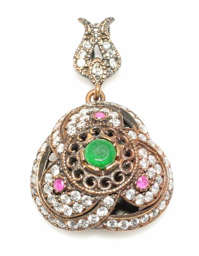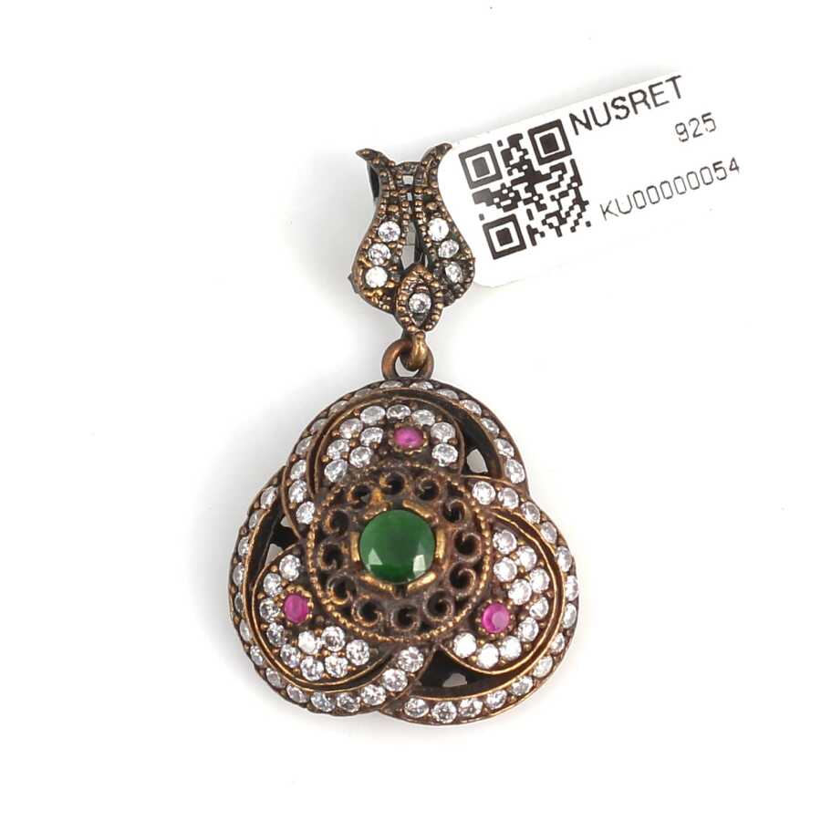 Kolye ucu 925 ayar gümüş ve bronzdan imal edilmiştir. Minik yuvarlak şeklinde kolye ucu 2,4 cm'ye 4,1 cm boyutlarındadır. Zincir dahil değildir. Kolye ucu sentetik zümrüt ve zirkon taşları vardır. Otantik kolye ucu 8,19 gram ağırlığındadır.