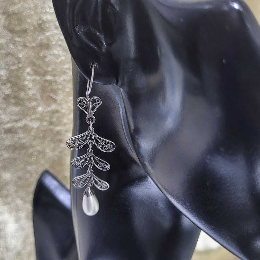 925 Ayar Gümüş Damla İncili Telkâri Yaprak Küpe