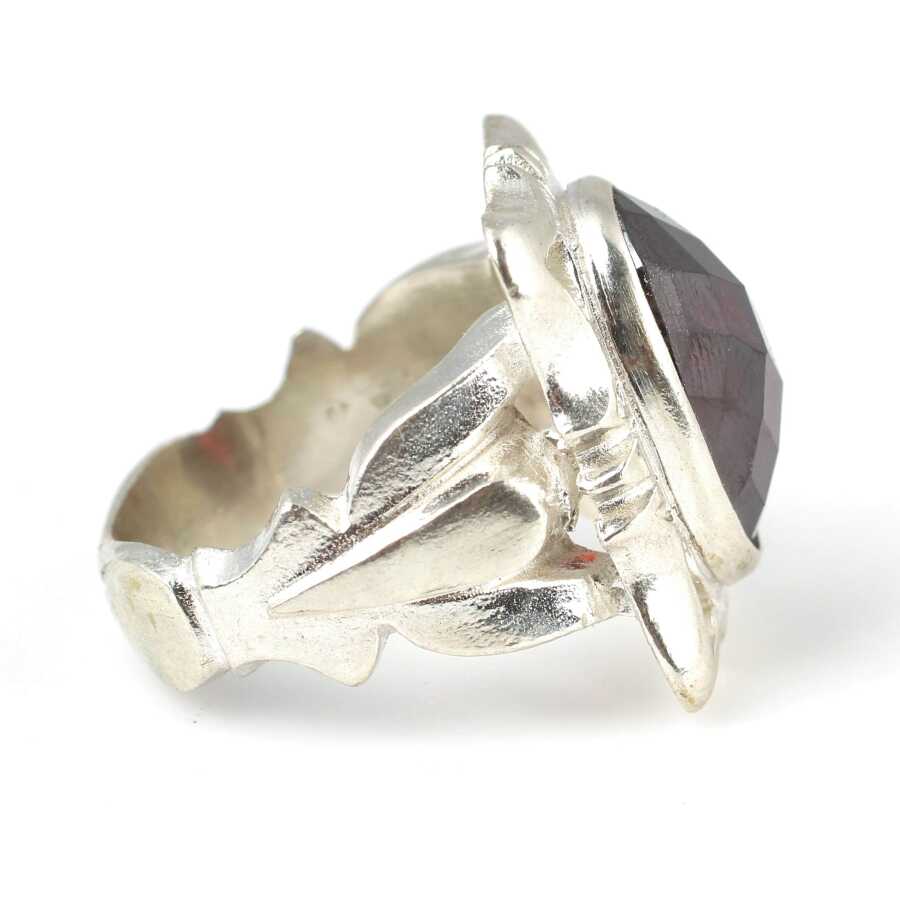 Gelince Haber VerYüzük 850 ayar gümüşten üretilmiştir. Taşlı yüzüğün üst kısmı 25*20 cm boyutlarındadır. Resimdeki yüzük 25 ölçüdür, ancak tüm ölçüler özel olarak yapılabilmektedir. Yüzük fasetli garnet renk taşlıdır. Ağırlığı 21,53 gramdır.