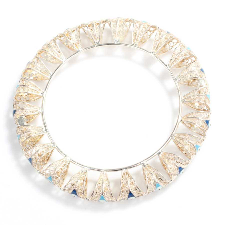 Bilezik 925 ayar gümüşten imal edilmiştir. Telkari bilezik 6,2 cm çapındadır. Bilezik taşsızdır. Telkari bilezik üzerinde mineli göz boncuğu desenleri vardır. Gümüş bilezik 28,01 gram ağırlığındadır.