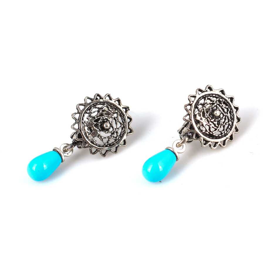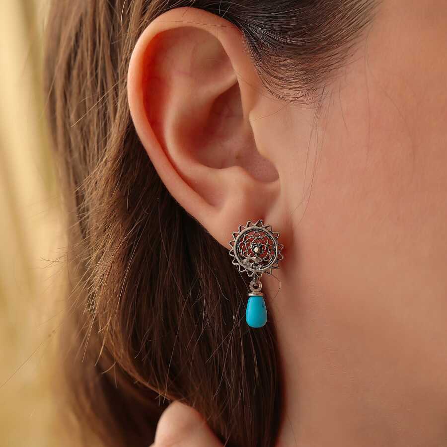 925 Ayar Gümüş Güneş Şekilli Telkâri Yuvarlak, Damla Firuzeli Küpe