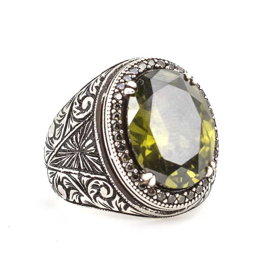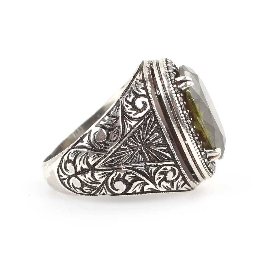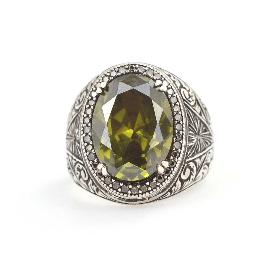 Yüzük 925 ayar gümüşten üretilmiştir. Taşlı yüzük 2,0 cm'ye 1,5 cm boyutlarındadır. Resimdeki yüzük 23 ölçüdür, ancak tüm ölçüler özel olarak yapılabilmektedir. Yüzük peridot taşlıdır. Ağırlığı 14,28 gramdır.