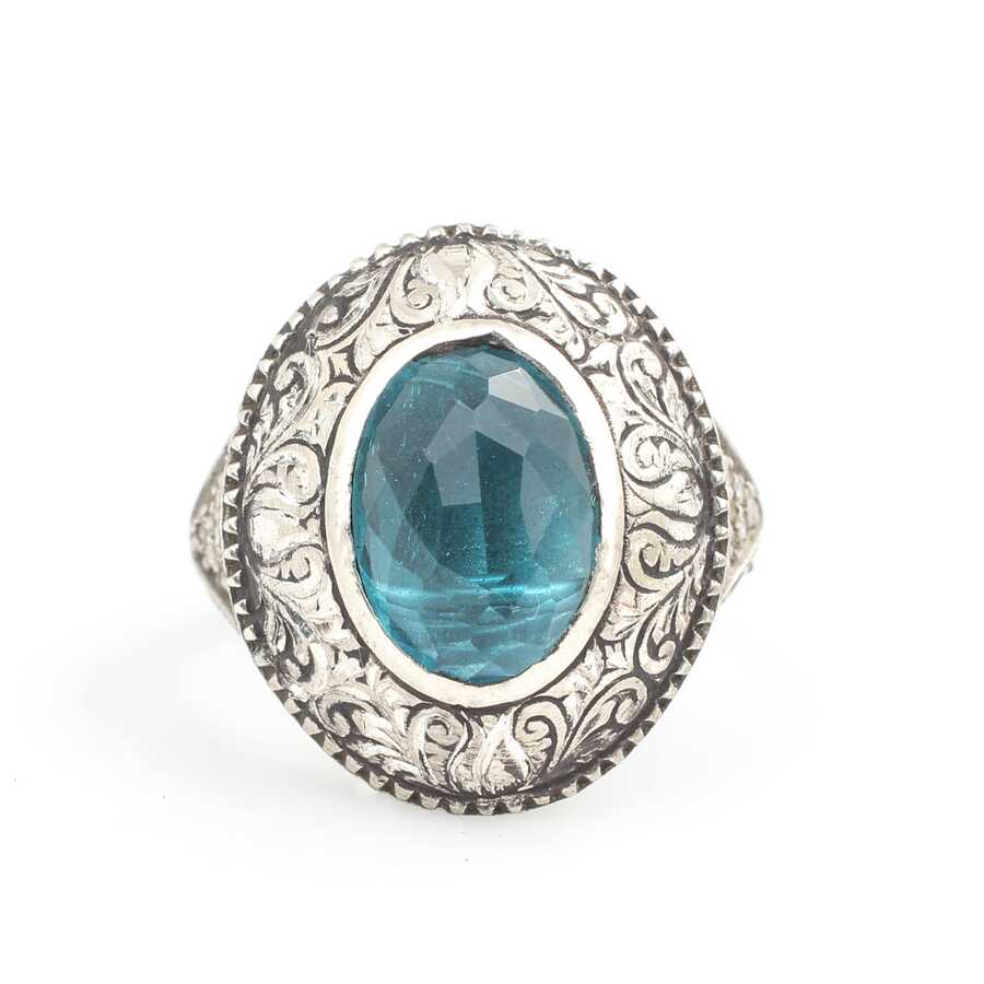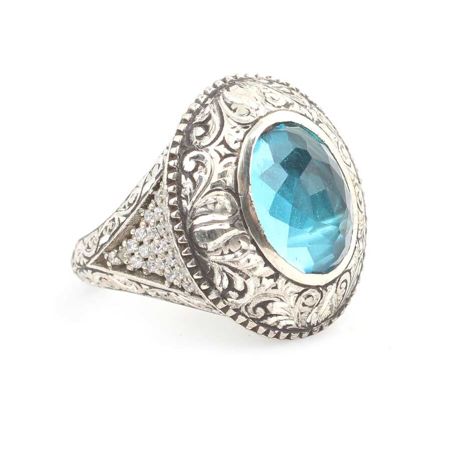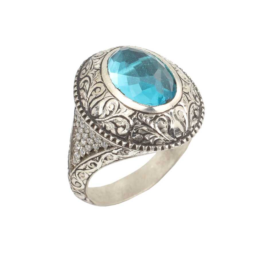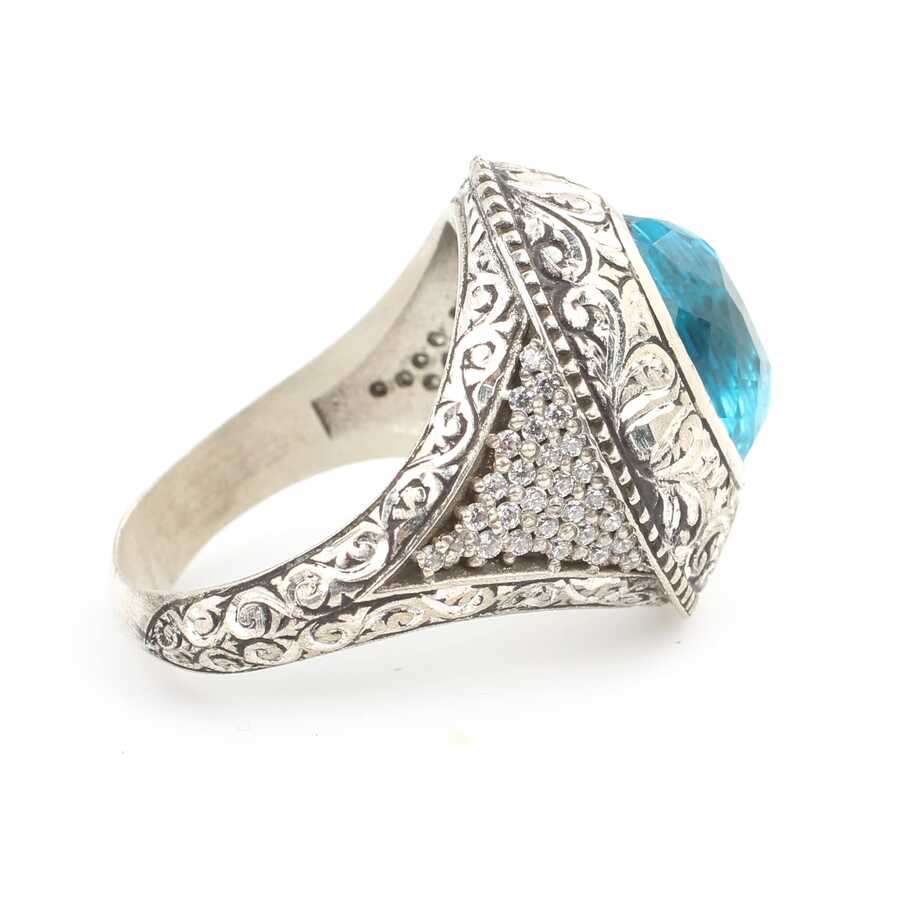 Yüzük 925 ayar gümüşten üretilmiştir. Yüzüğün üzerinde el kalemi atılarak tasarlanmıştır. Taşlı yüzük 2,5 cm'ye 2,1 cm boyutlarındadır. Resimdeki yüzük 26 ölçüdür, ancak tüm ölçüler özel olarak yapılabilmektedir. Yüzük akuamarin renk taşlıdır. Ağırlığı 21,33 gramdır.