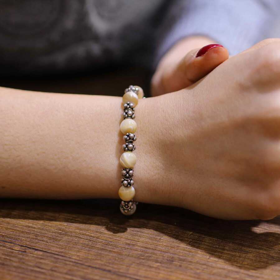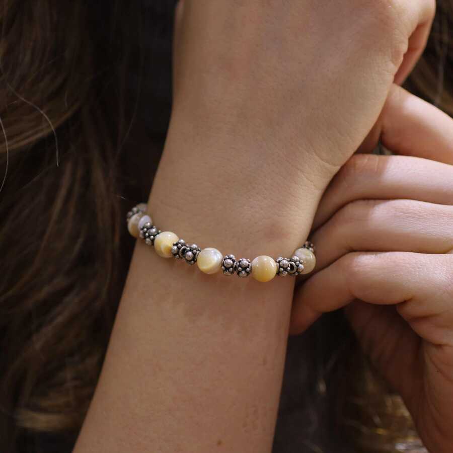 Bileklik 925 ayar gümüşten imal edilmiştir. Gümüş parçalı model bileklik 0,8 cm eninde ve 20 cm uzunluğundadır. Bileklik sedef taşlıdır. Bileklik taş aralarında gümüş parçalar kullanılarak tasarlanmıştır. Gümüş bileklik 26,77 gram ağırlığındadır.