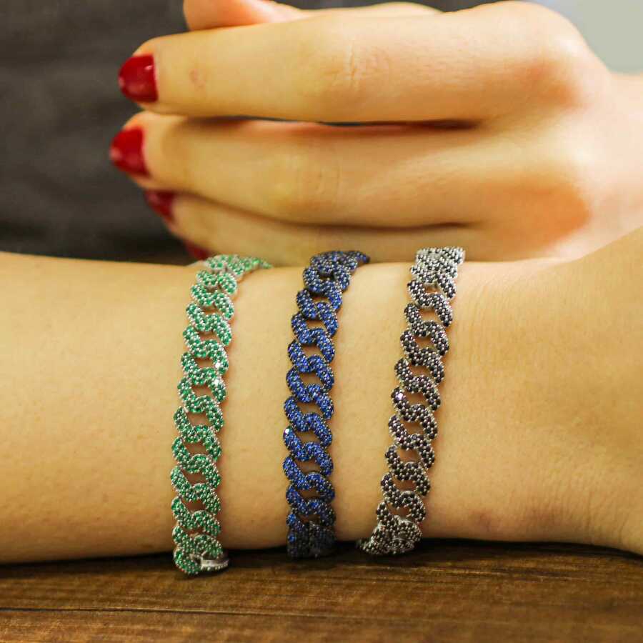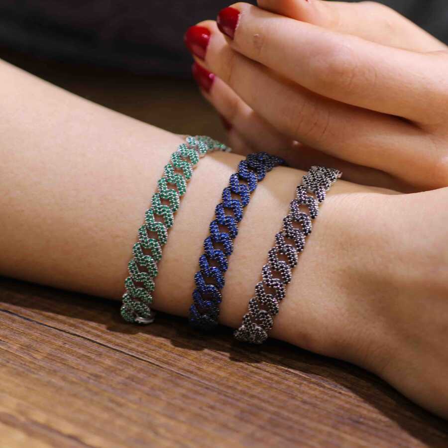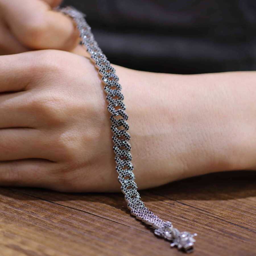Bileklik 925 ayar gümüşten imal edilmiştir. Taşlı gurmet zincir bileklik 0,9 cm eninde ve 18 cm uzunluğundadır. Bileklik siyah zirkon taşlıdır. Gümüş bileklik 17,9 gram ağırlığındadır.