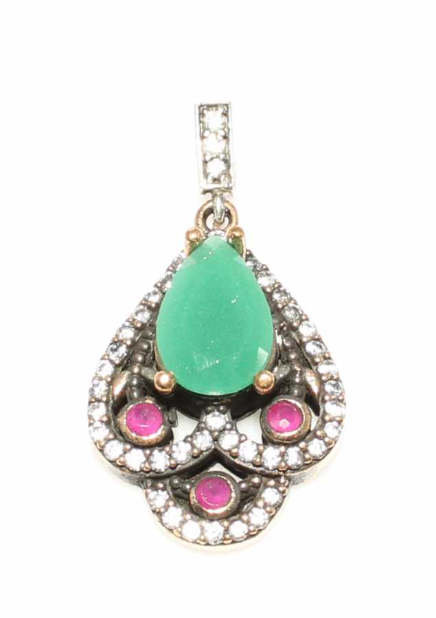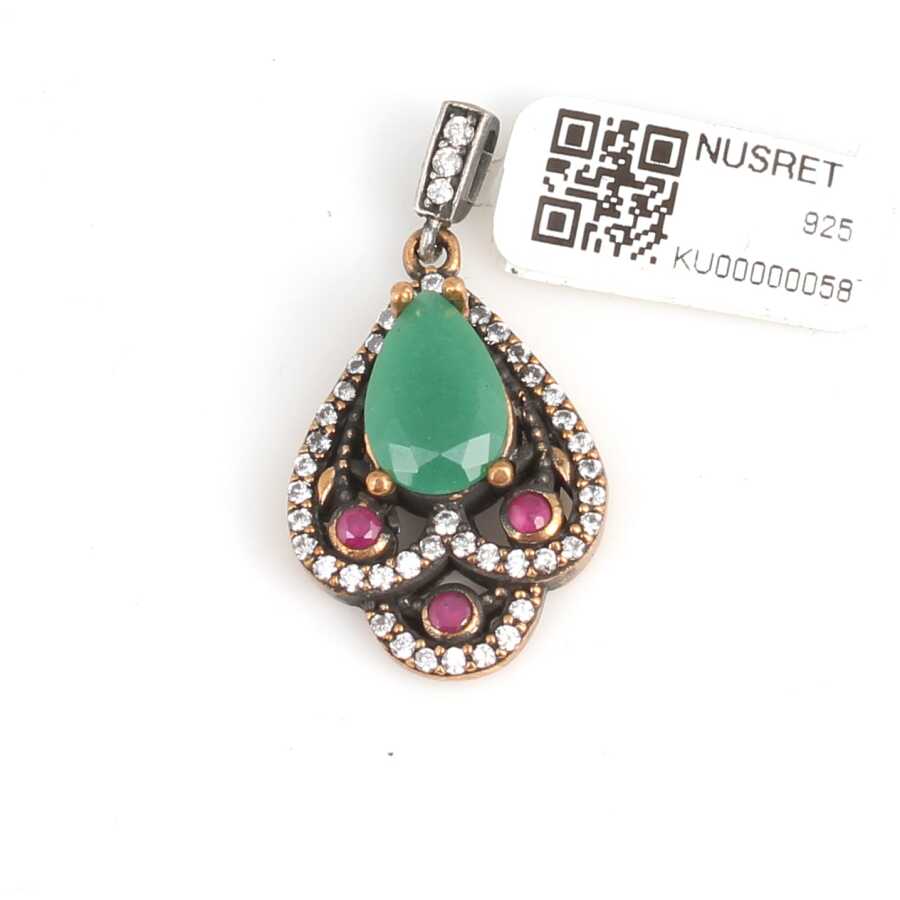 Kolye ucu 925 ayar gümüş ve bronzdan imal edilmiştir. Şekilsiz şeklinde kolye ucu 1,8 cm'ye 3,3 cm boyutlarındadır. Zincir dahil değildir. Kolye ucu sentetik zümrüt ve zirkon taşları vardır. Otantik kolye ucu 6,01 gram ağırlığındadır.