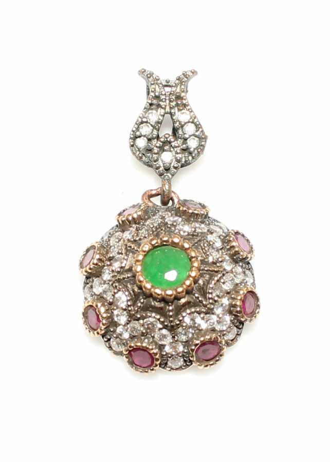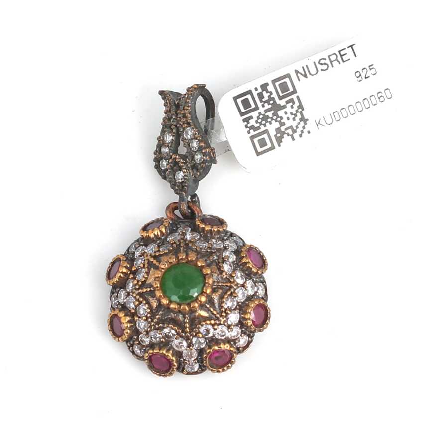 Kolye ucu 925 ayar gümüş ve bronzdan imal edilmiştir. Minik bombeli yuvarlak şeklinde kolye ucu 1,9 cm'ye 3,6 cm boyutlarındadır. Zincir dahil değildir. Kolye ucu sentetik zümrüt ve zirkon taşları vardır. Otantik kolye ucu 7,01 gram ağırlığındadır.