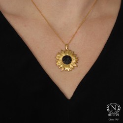 925 Ayar Gümüş Ayçiçek Kolye, Siyah Taşlı