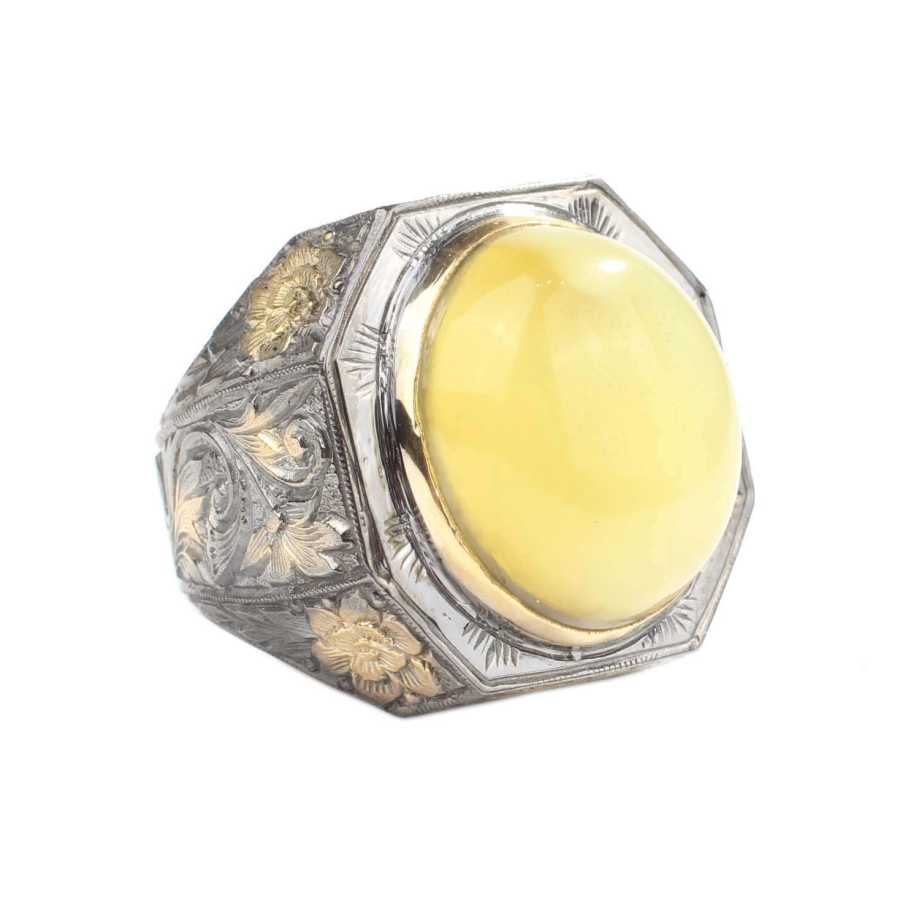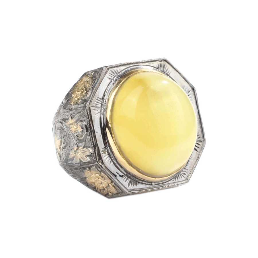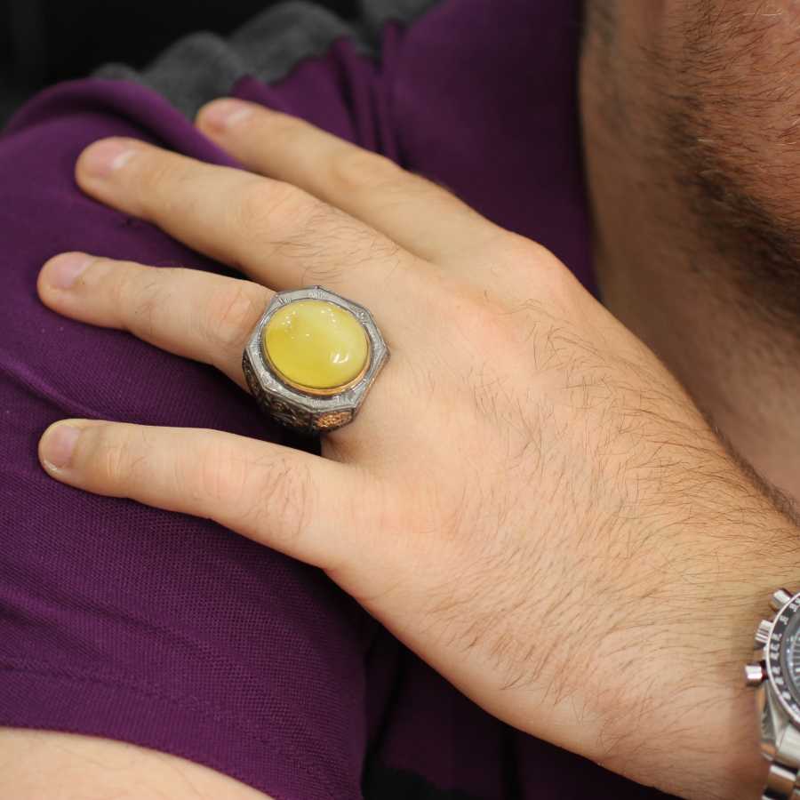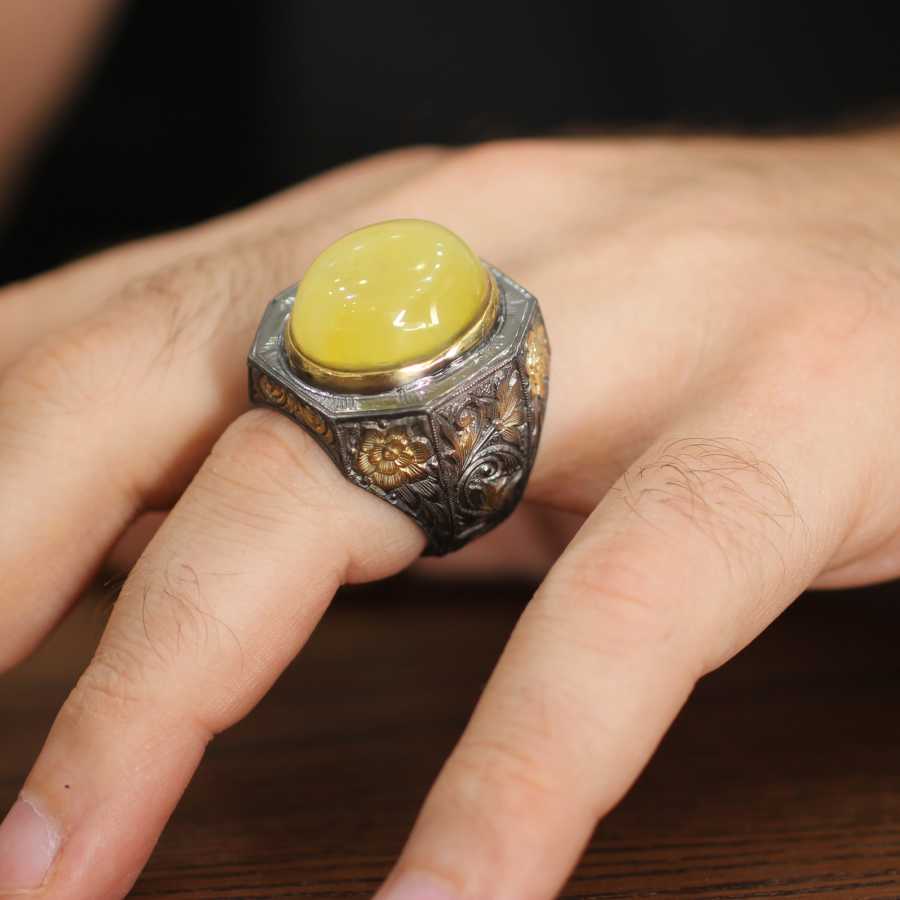 Yüzük 925 ayar gümüşten üretilmiştir. Yüzüğün üzerinde el kalemi atılarak tasarlanmıştır. Gerçek Kehribar taşlı usta işi erkek yüzük, siyah rodajlıdır. Resimdeki yüzük 25 ölçüdür, ancak tüm ölçüler özel olarak yapılabilmektedir. Yüzük gerçek kehribar taşlıdır. Ağırlığı 32,26 gramdır.