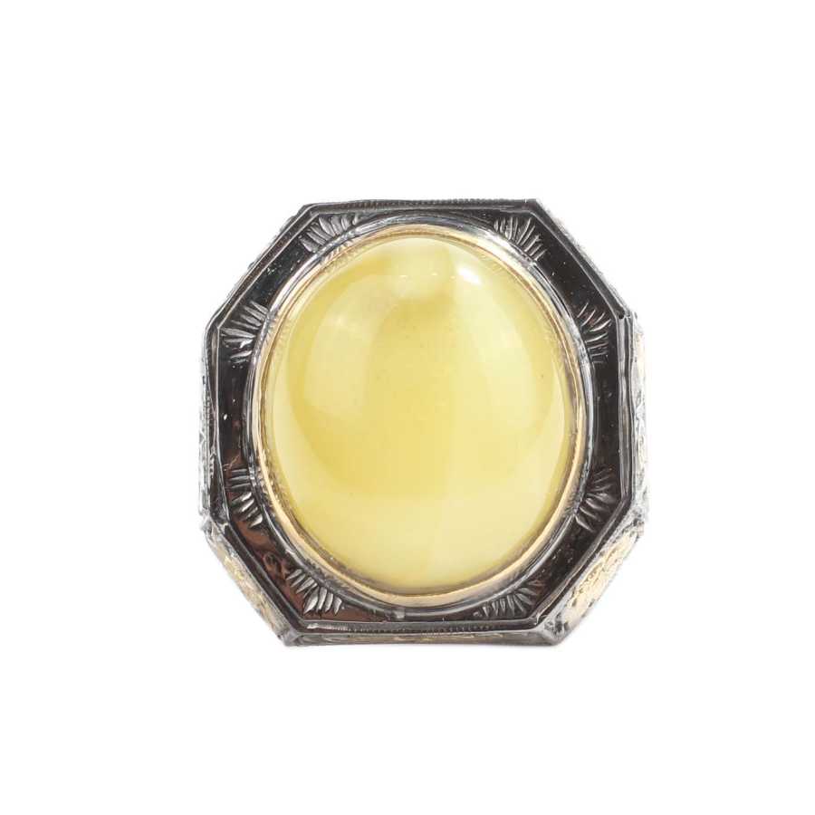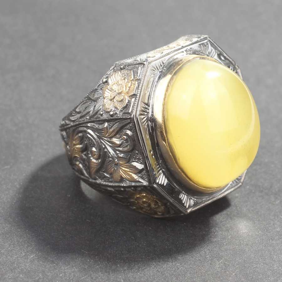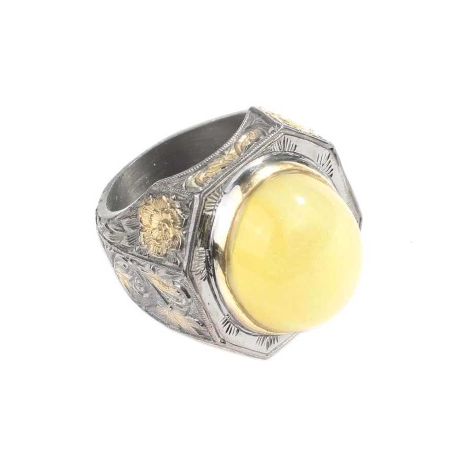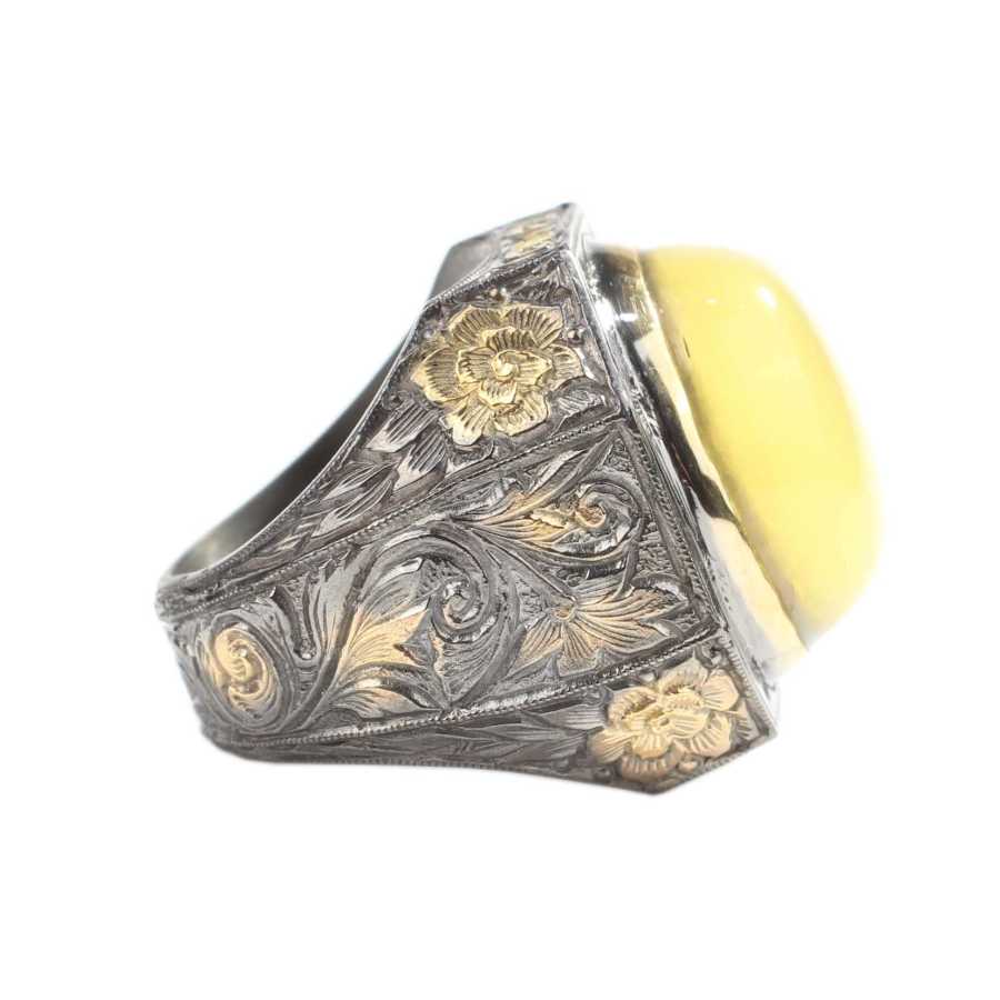Yüzük 925 ayar gümüşten üretilmiştir. Yüzüğün üzerinde el kalemi atılarak tasarlanmıştır. Gerçek Kehribar taşlı usta işi erkek yüzük, siyah rodajlıdır. Resimdeki yüzük 25 ölçüdür, ancak tüm ölçüler özel olarak yapılabilmektedir. Yüzük gerçek kehribar taşlıdır. Ağırlığı 32,26 gramdır.