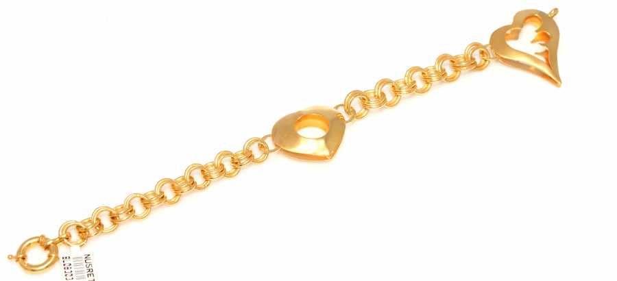 Bileklik 22 ayar altından imal edilmiştir. Kalp model bileklik 23 cm uzunluğundadır. El işi bileklik 3,7 cm genişliğindedir. Astar bombe şekil verdirilerek alt kısmı kapalı orta kısmı boşaltılarak imal edilmiştir. Zincir ile tamamlanmıştır. Bileklik taşsızdır. El işi bileklik 20,42 gram ağırlığındadır.