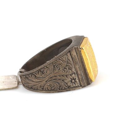 24 ayar altın ve 925 ayar gümüş yüzük ölçüsü: 20,50 x 1,4 cm`dir. Gümüş yüzük altın resimlidir. Gramı: 0,58 gr