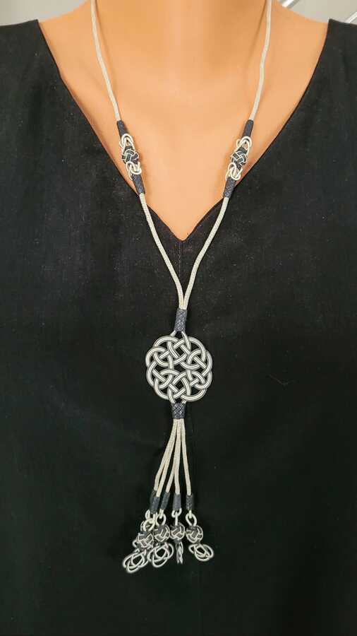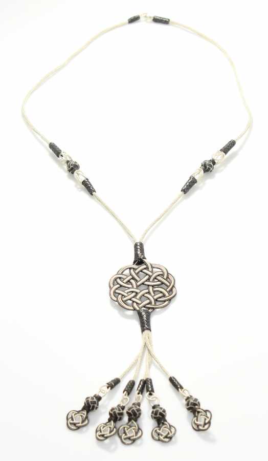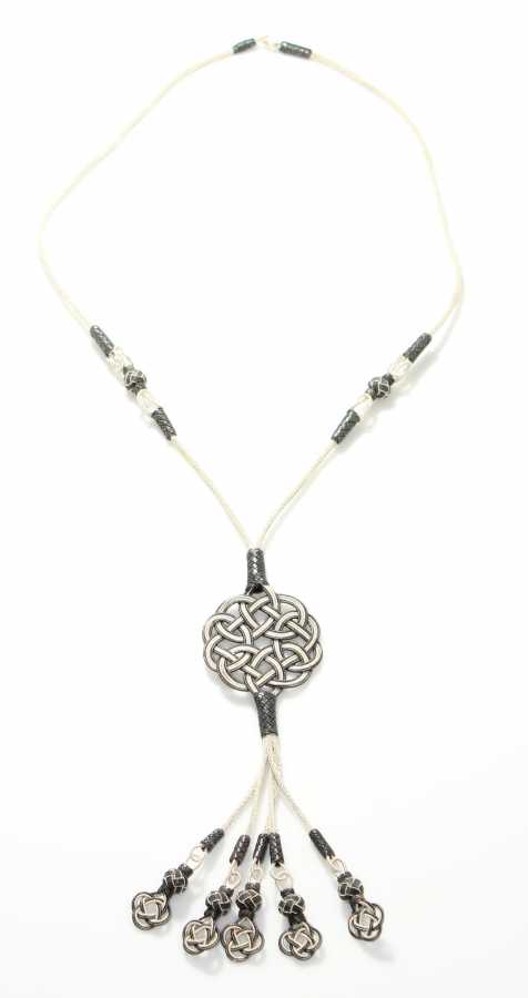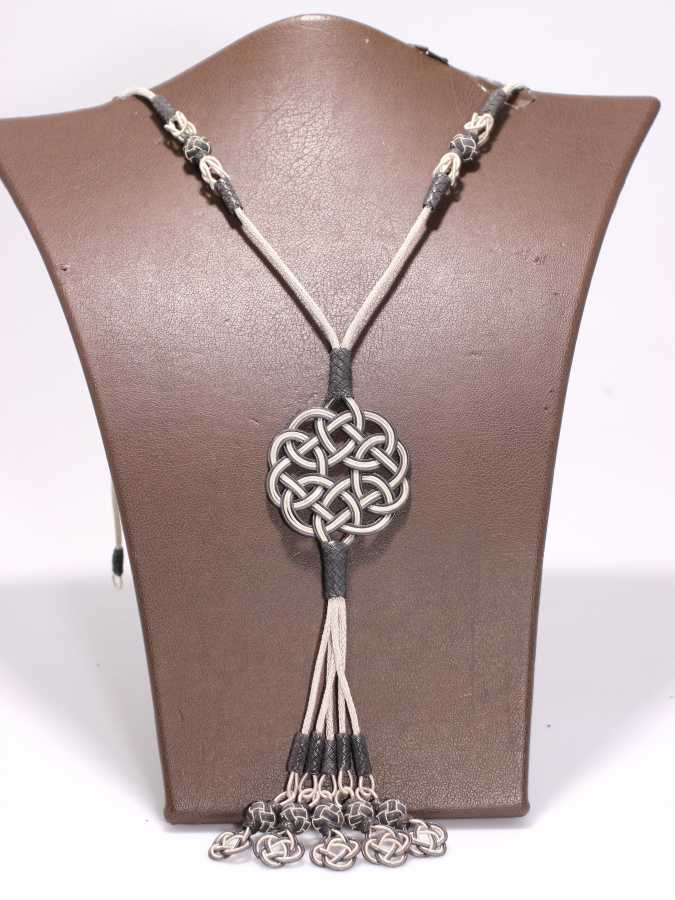 Kolye 999 ayar gümüşten imal edilmiştir. El örgüsü kazaz model kolyenin ortasında aşk düğümü şekli vardır. Gümüş kolye 37,97 gram ağırlığındadır.