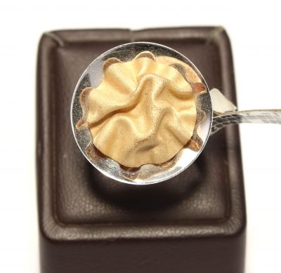 Yüzük 14 ayar altından üretilmiştir. Kırışık model yüzük 19 ölçüdür. Tüm ölçüler yapılabilmektedir. Yüzük 2,3 cm enindedir. İç bükey astarın iç kısmına kırışık desen verilerek tasarlanmıştır. Yüzük taşsızdır. Ağırlığı 7,55 gramdır.