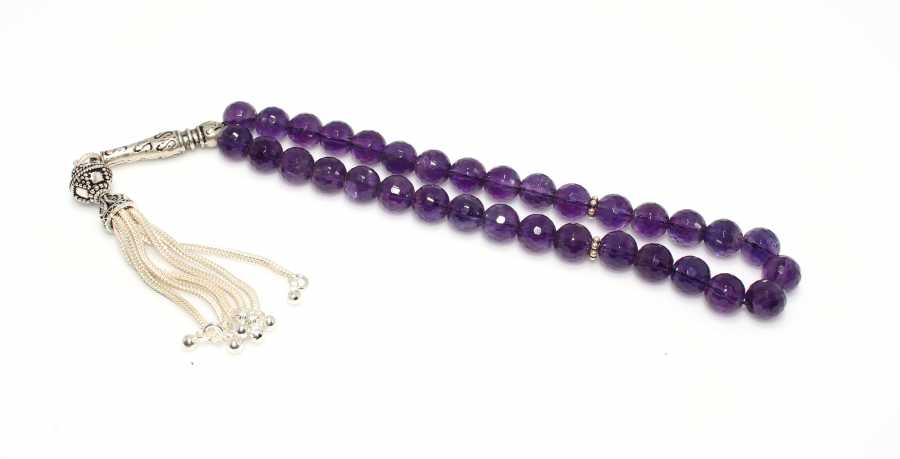 Küre kesim ametist taşı tesbih 0,8 cm boyutlarındadır. Gümüş püskülü dahil tespih toplam uzunluğu 23 cm'dir. Tespihin ağırlığı 33,49 gramdır.