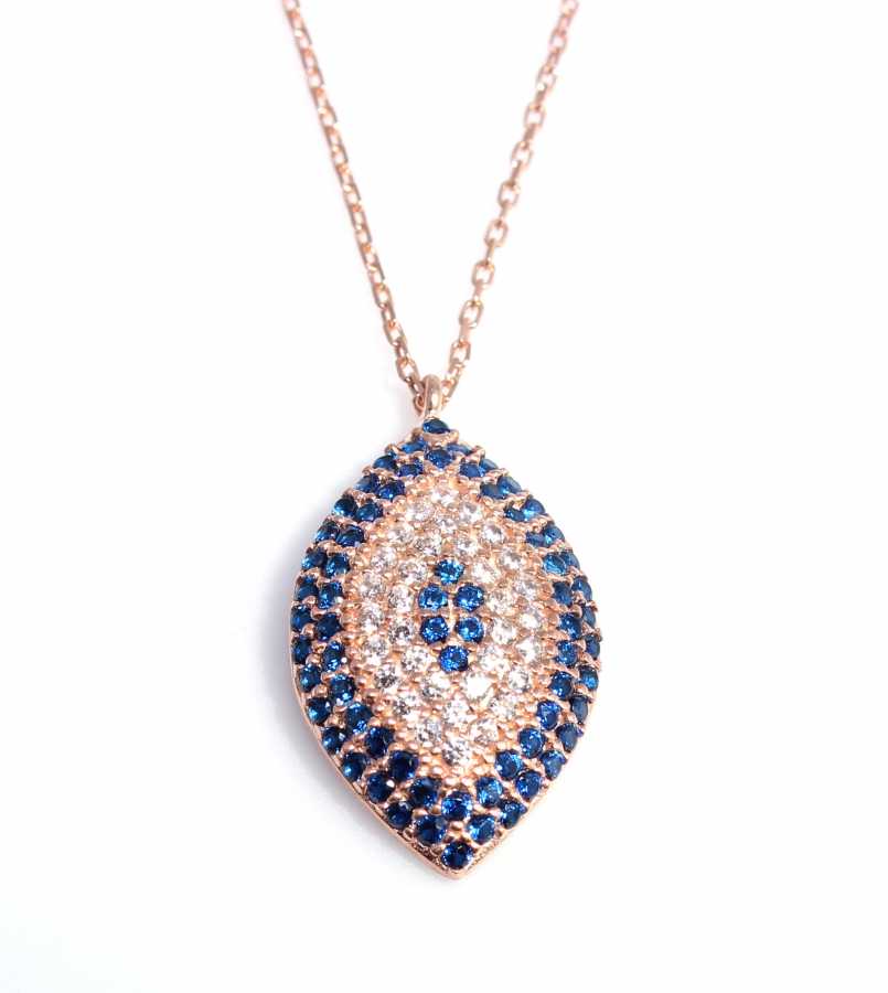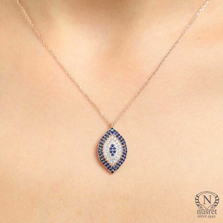 Gümüş kolye 925 ayar gümüşten yapılmıştır. Mekik şeklinde nazar boncuğu kolye 2,4 cm'ye 1,3 cm boyutlarındadır. Zinciri 41 cm uzunluğundadır. Kolye zirkon taşlıdır. Gümüş renklidir. Ağırlığı 2,81 gramdır.